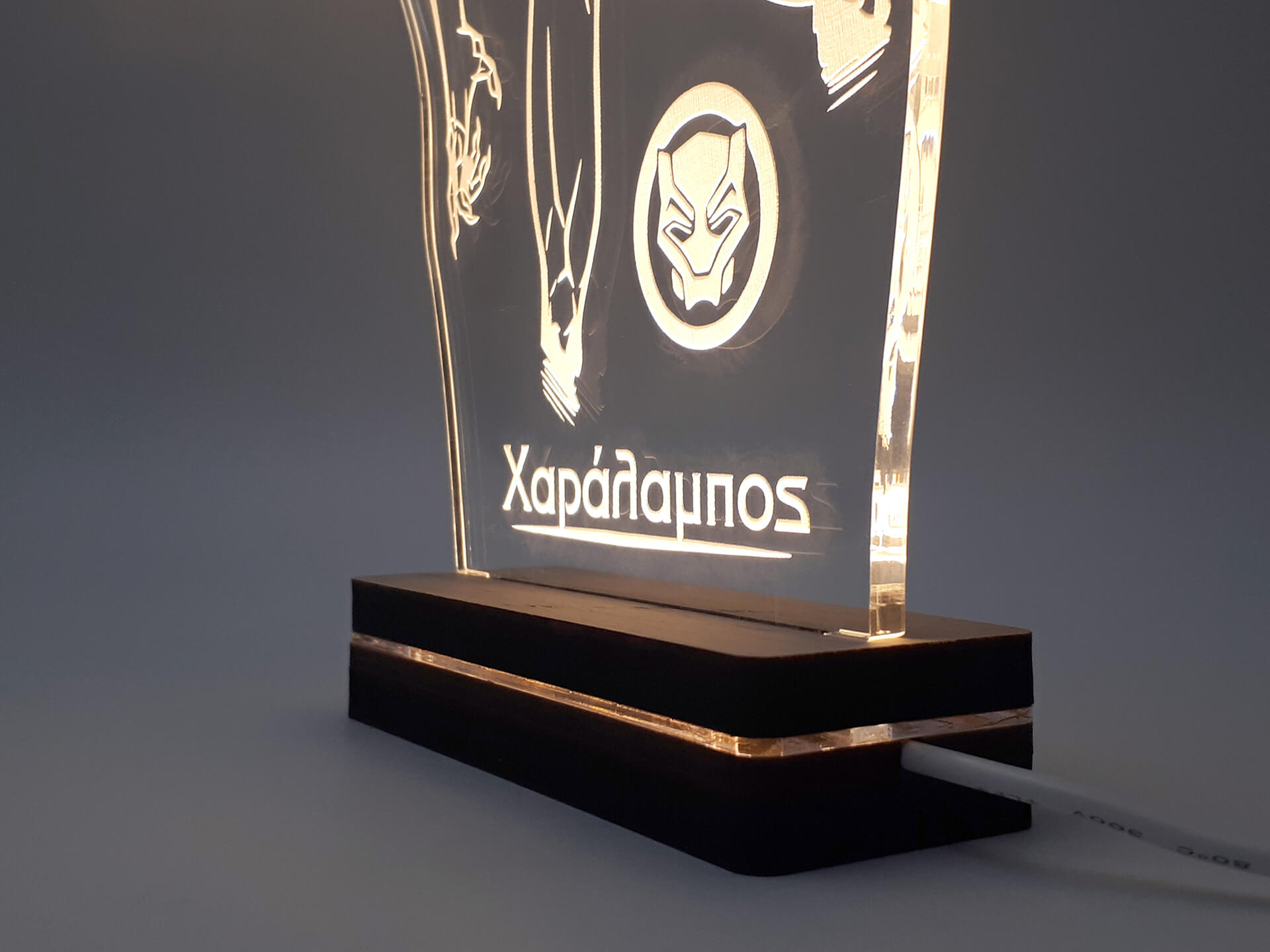 • Υλικά: Led λευκού χρώματος, Ακρυλικό διάφανο πάχους 6mm, Χειροποίητη βάση από ξύλο και ακρυλικό