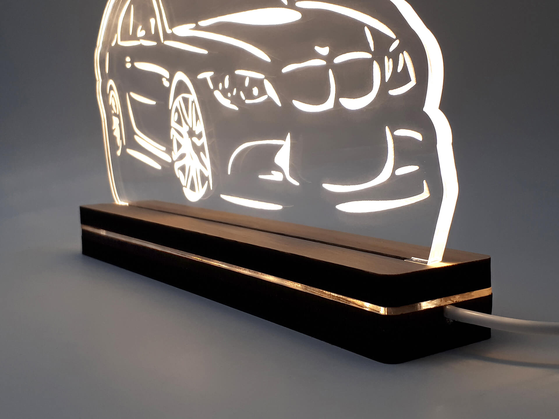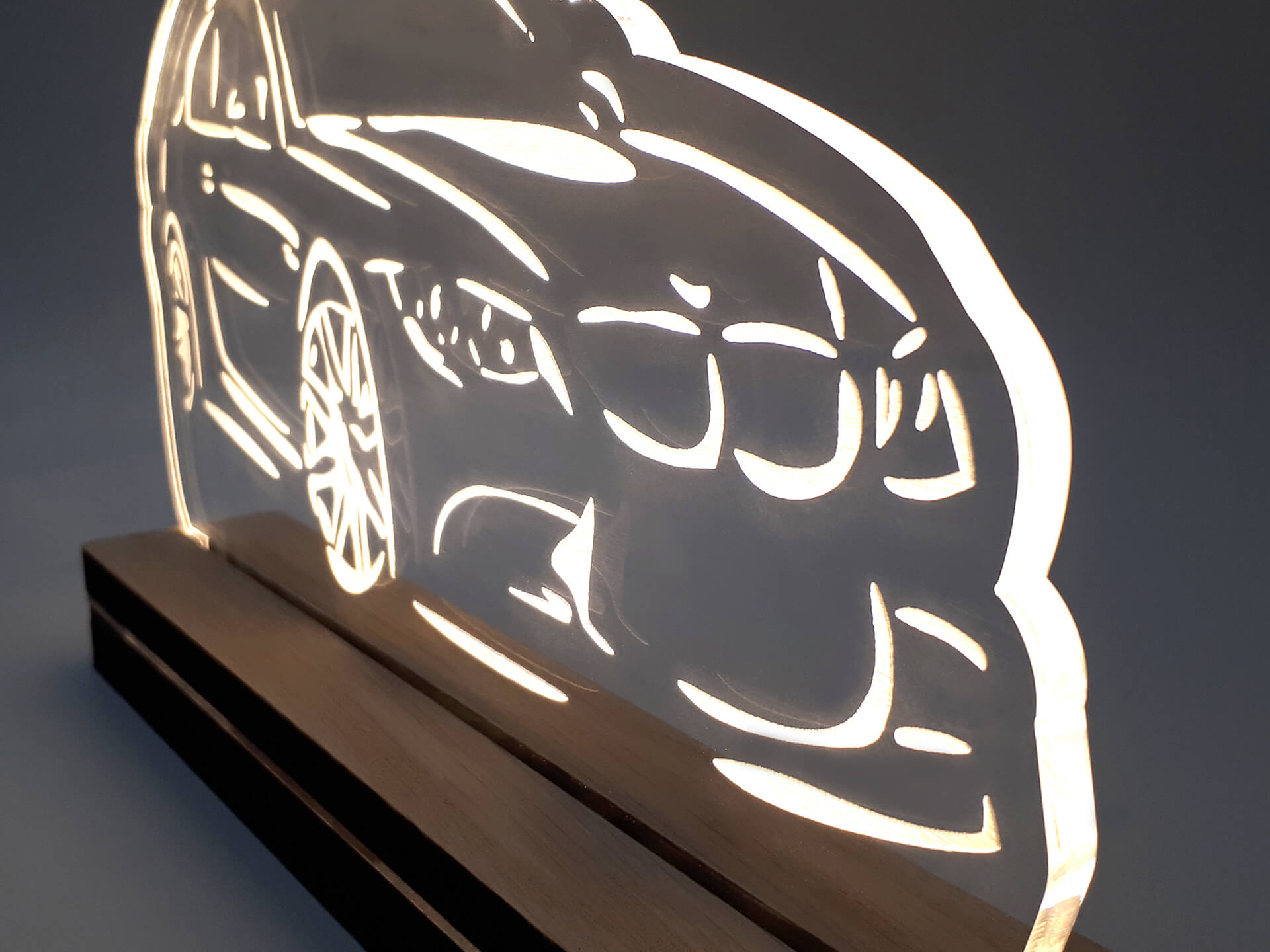 Φωτιστικό Led από ακρυλικό και ξύλινη χειροποίητη βάση δικής μας πρωτοποριακής σχεδίασης και κατασκευής.