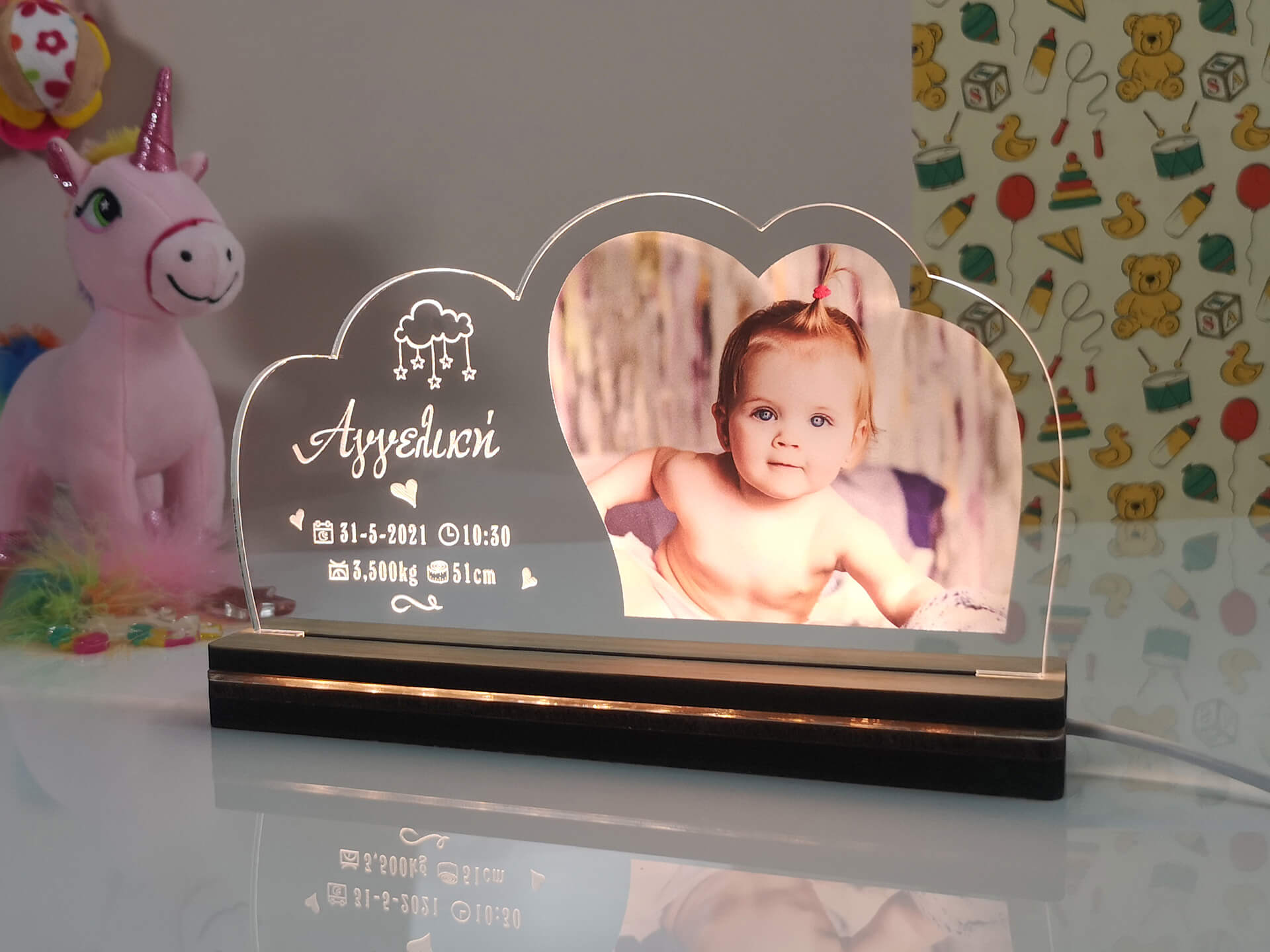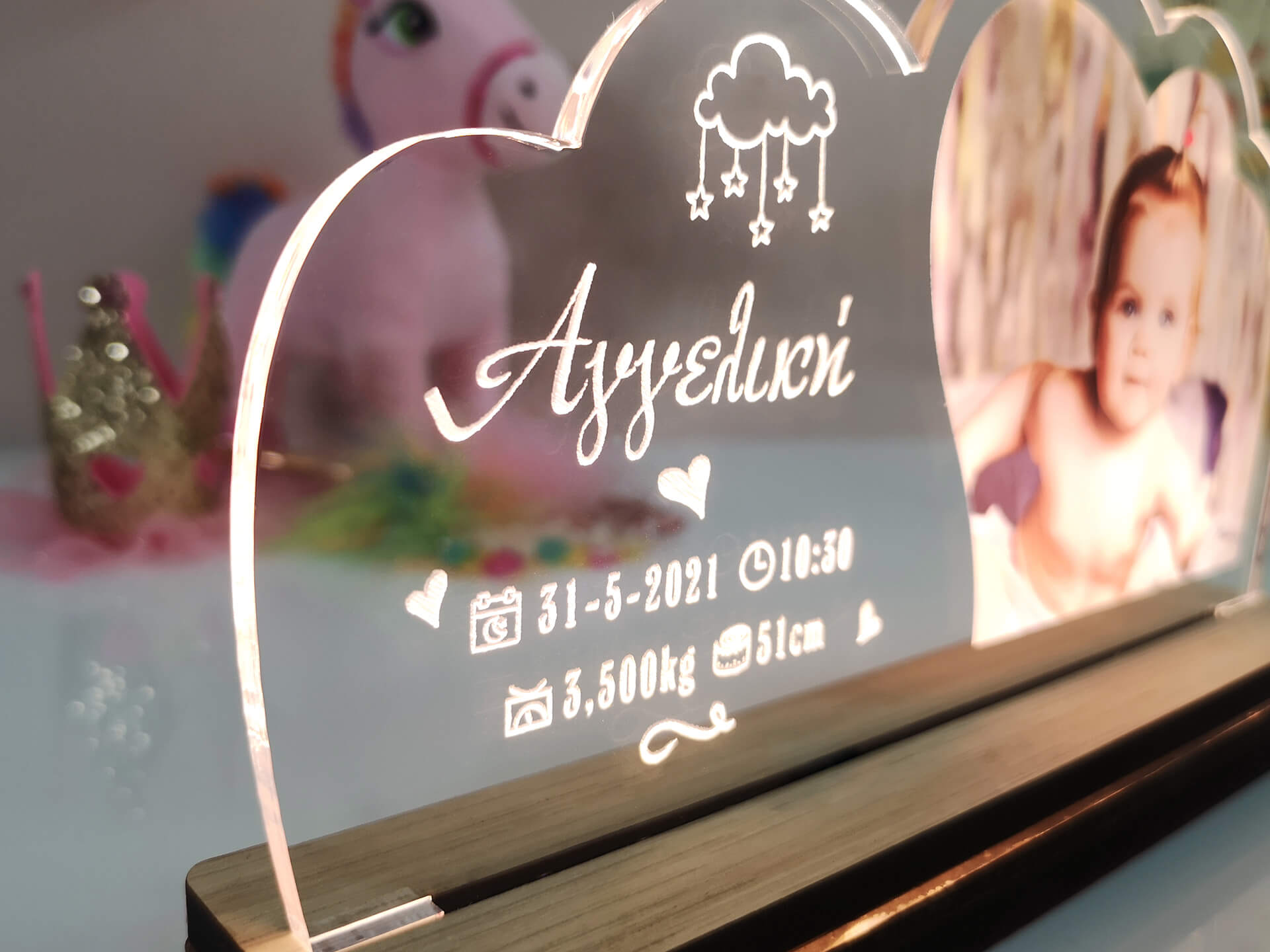 • Υλικά: Led λευκού χρώματος, Ακρυλικό διάφανο πάχους 6mm, Χειροποίητη βάση από ξύλο και ακρυλικό