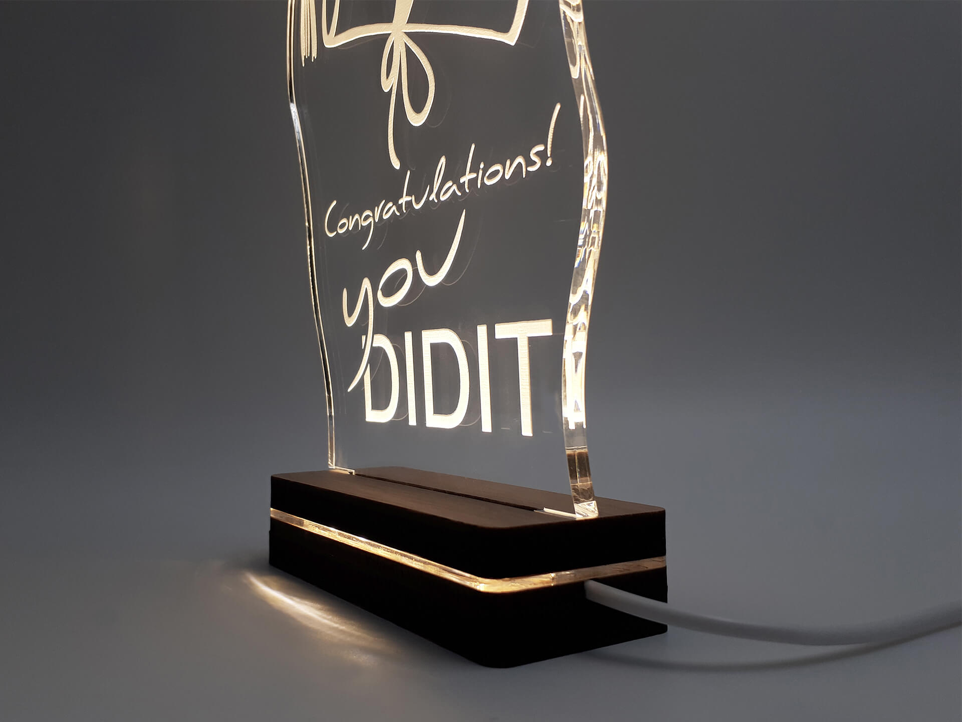 Φωτιστικό Led από ακρυλικό και ξύλινη χειροποίητη βάση δικής μας πρωτοποριακής σχεδίασης και κατασκευής.
