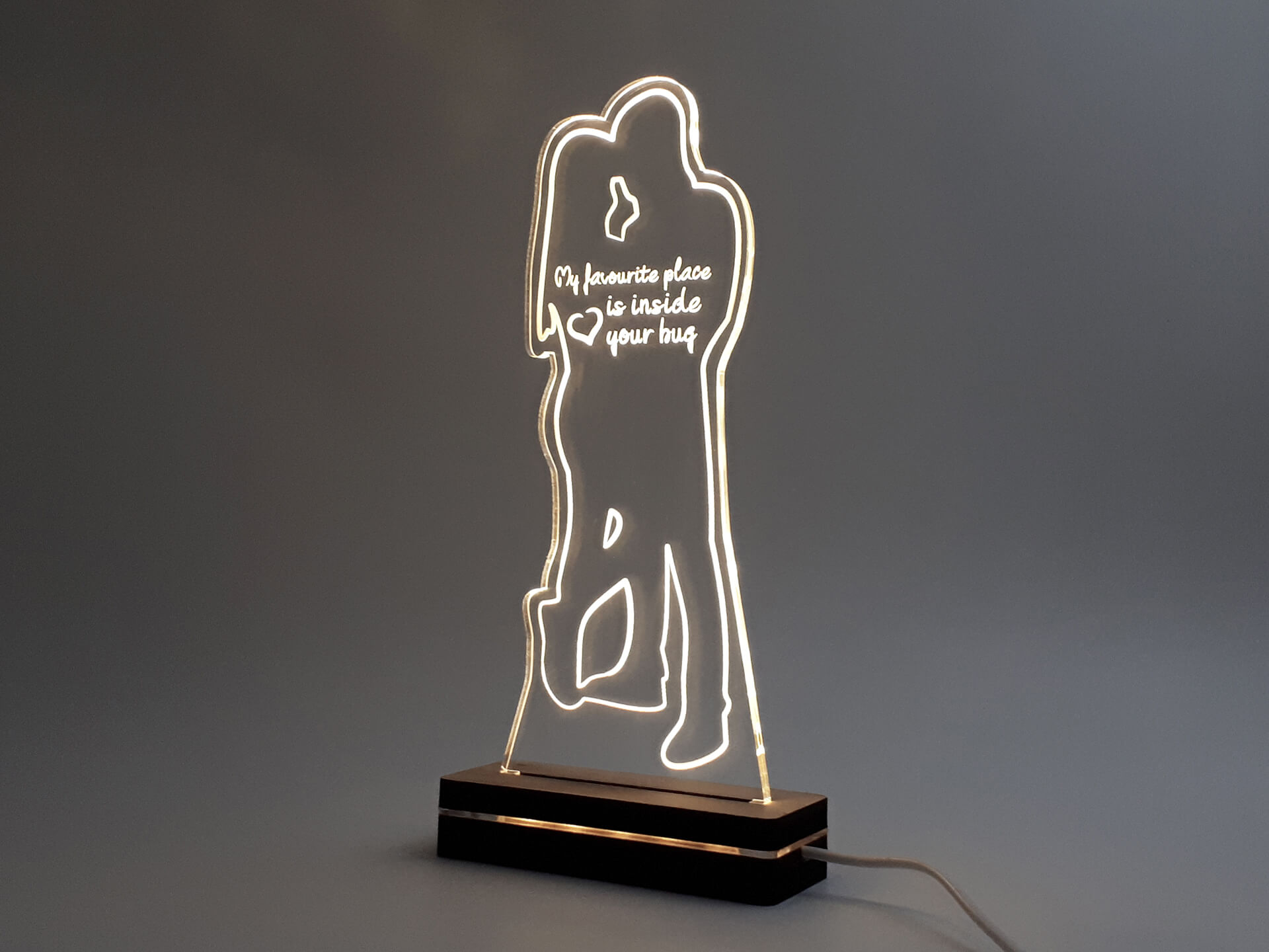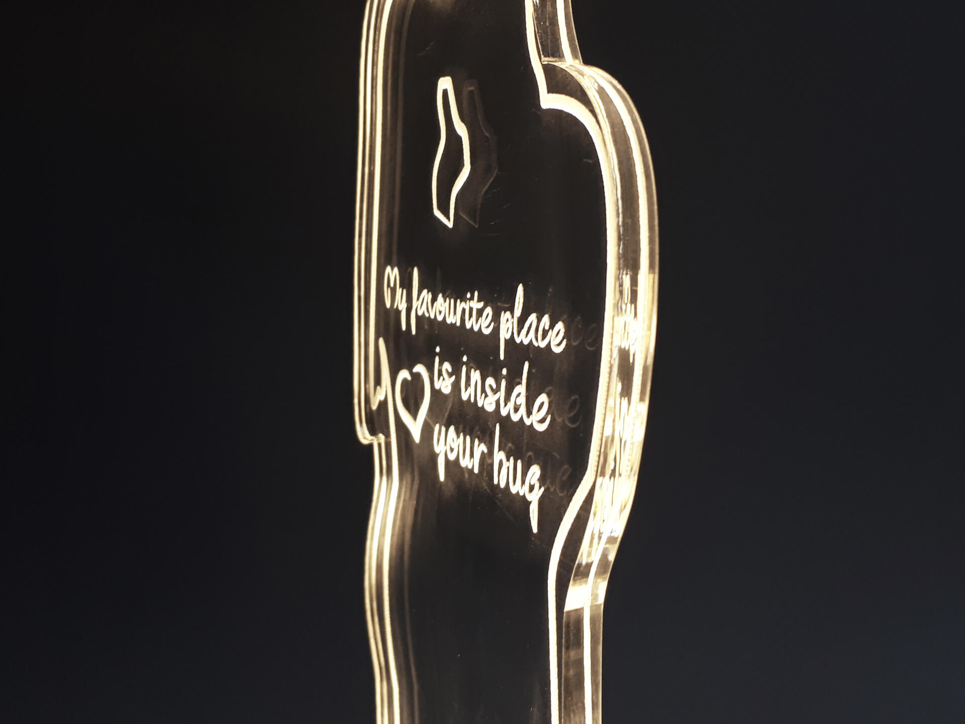 • Υλικά: Led λευκού χρώματος, Ακρυλικό διάφανο πάχους 6mm, Χειροποίητη βάση από ξύλο και ακρυλικό
