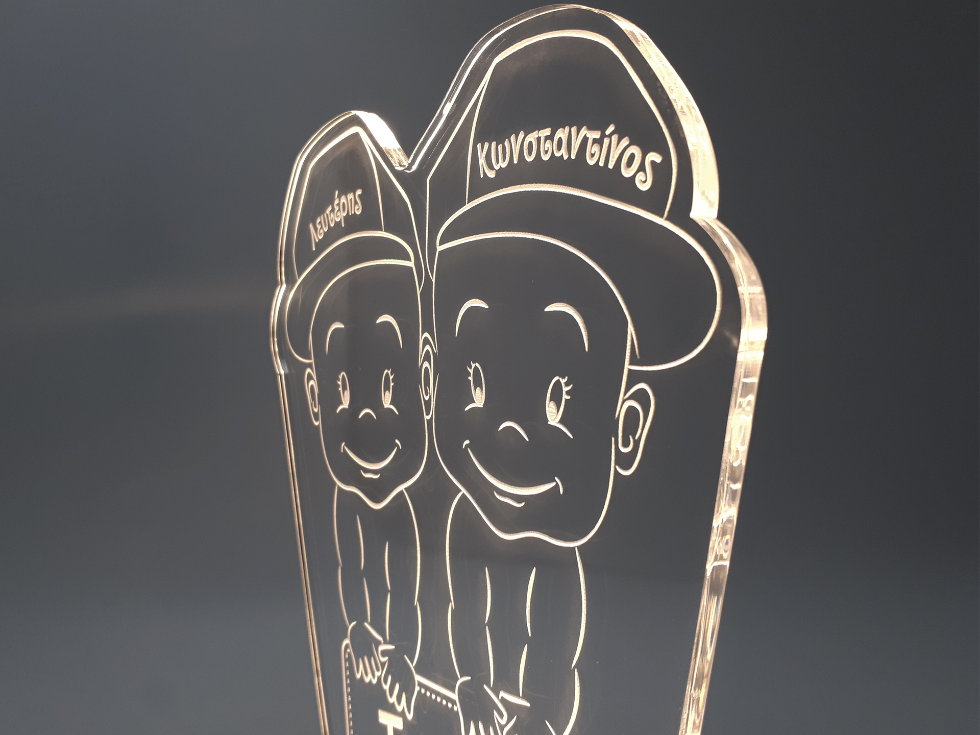 • Υλικά: Led λευκού χρώματος, Ακρυλικό διάφανο πάχους 6mm, Χειροποίητη βάση από ξύλο και ακρυλικό