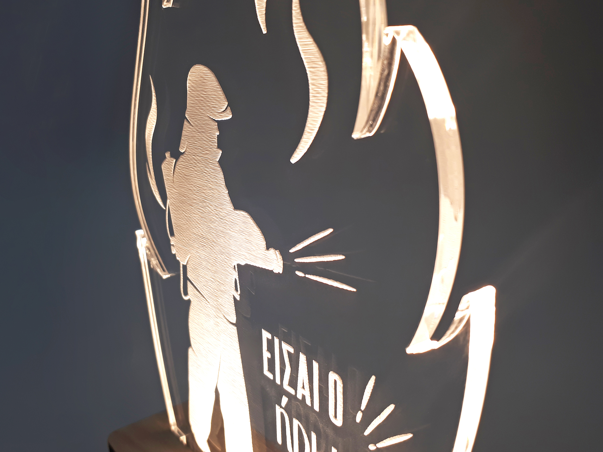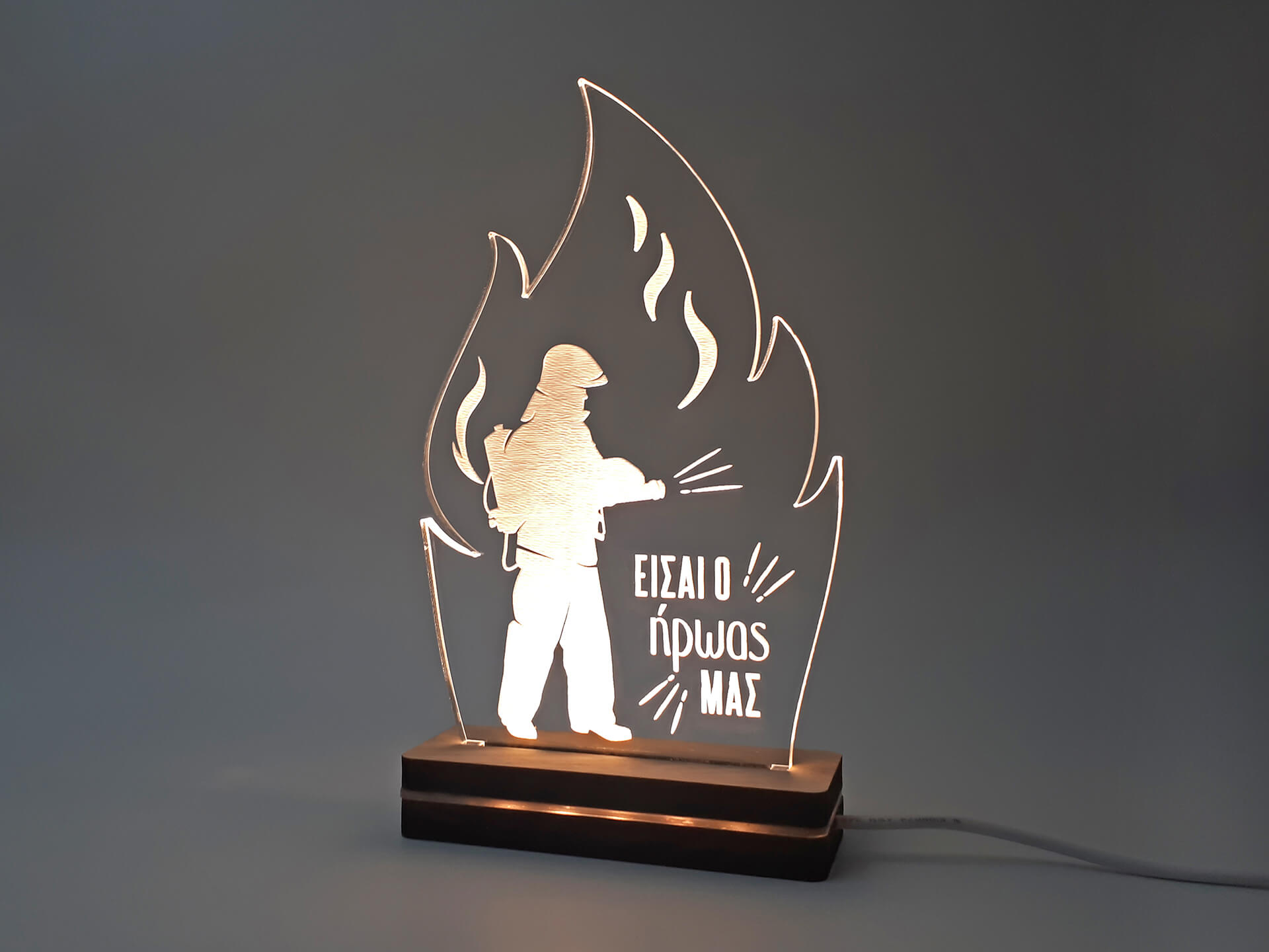 Μια γλυκιά υπενθύμιση της εκτίμησης και της αγάπης μας για τους ήρωες που εργάζονται καθημερινά για να μας προστατεύουν! Φωτιστικό Led από ακρυλικό και ξύλινη χειροποίητη βάση δικής μας πρωτοποριακής σχεδίασης και κατασκευής.