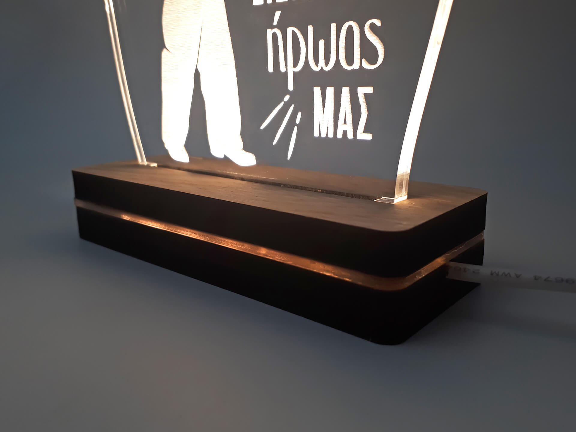 Φωτιστικό Led από ακρυλικό και ξύλινη χειροποίητη βάση δικής μας πρωτοποριακής σχεδίασης και κατασκευής.
