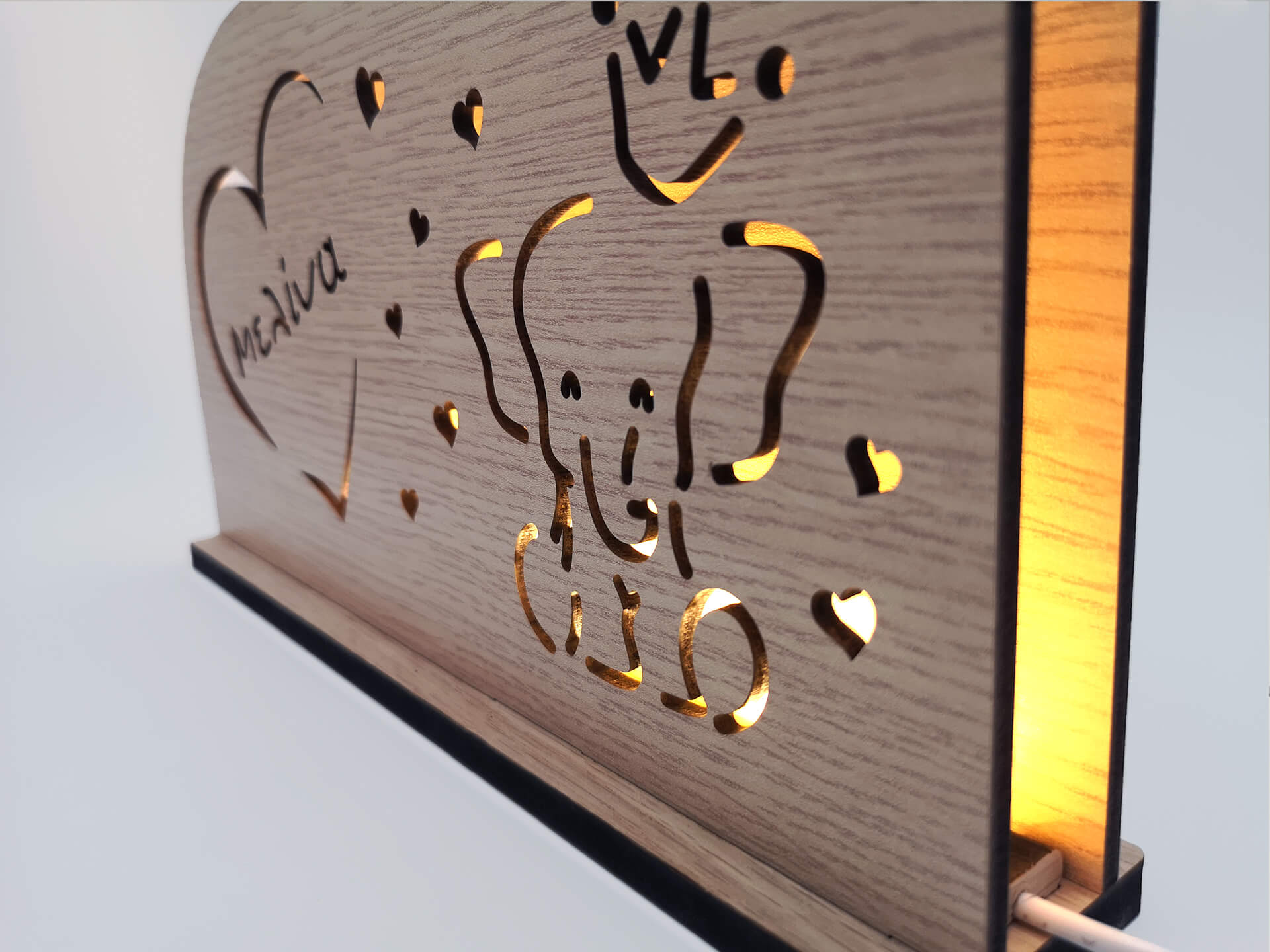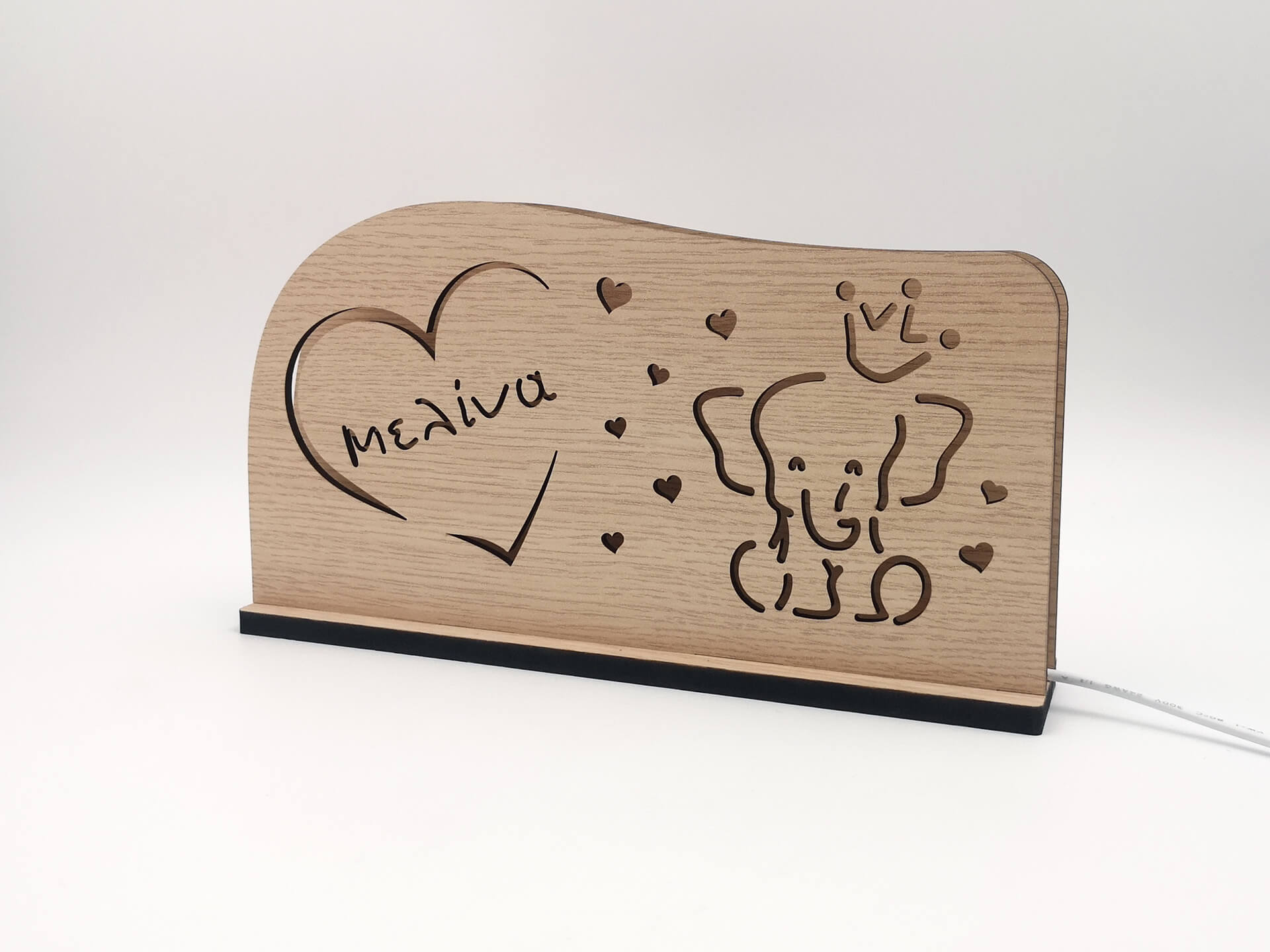 • Υλικά: Led λευκού χρώματος, Ξύλο πάχους 4mm, Χειροποίητη βάση από ξύλο