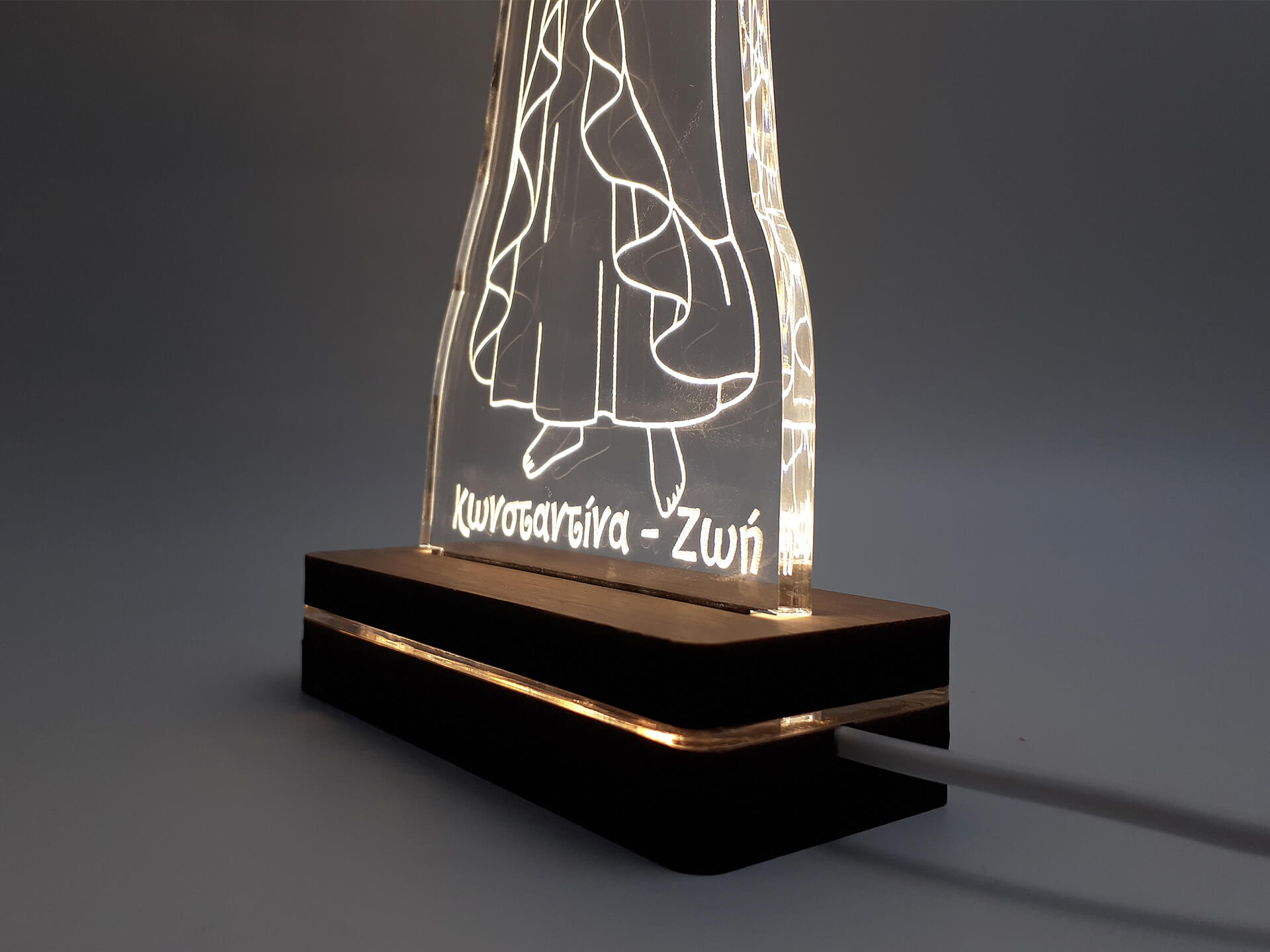 • Υλικά: Led λευκού χρώματος, ακρυλικό διάφανο πάχους 6mm, Χειροποίητη βάση από ξύλο και ακρυλικό
