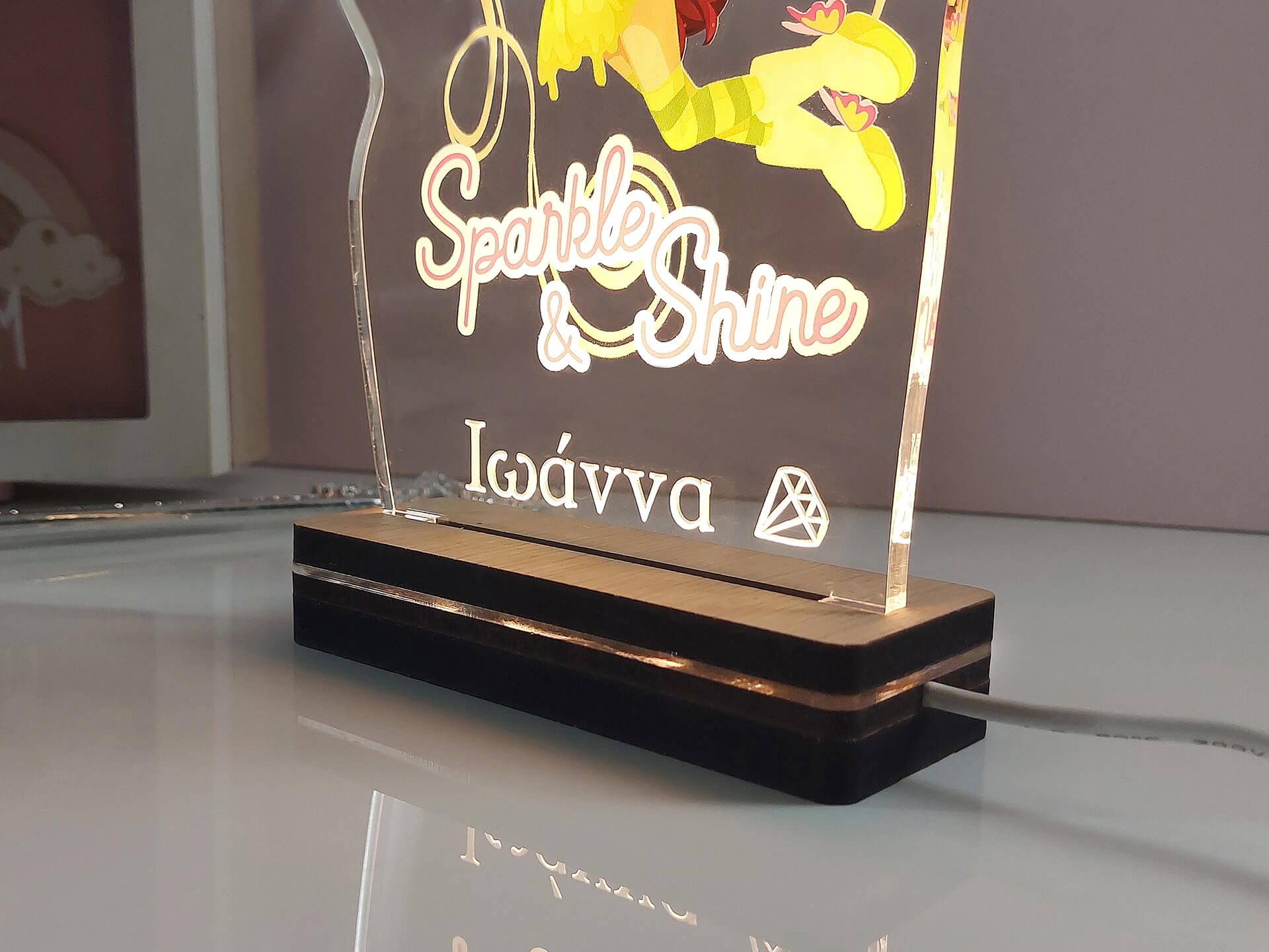 • Υλικά: Led λευκού χρώματος, Ακρυλικό διάφανο πάχους 6mm, Χειροποίητη βάση από ξύλο και ακρυλικό