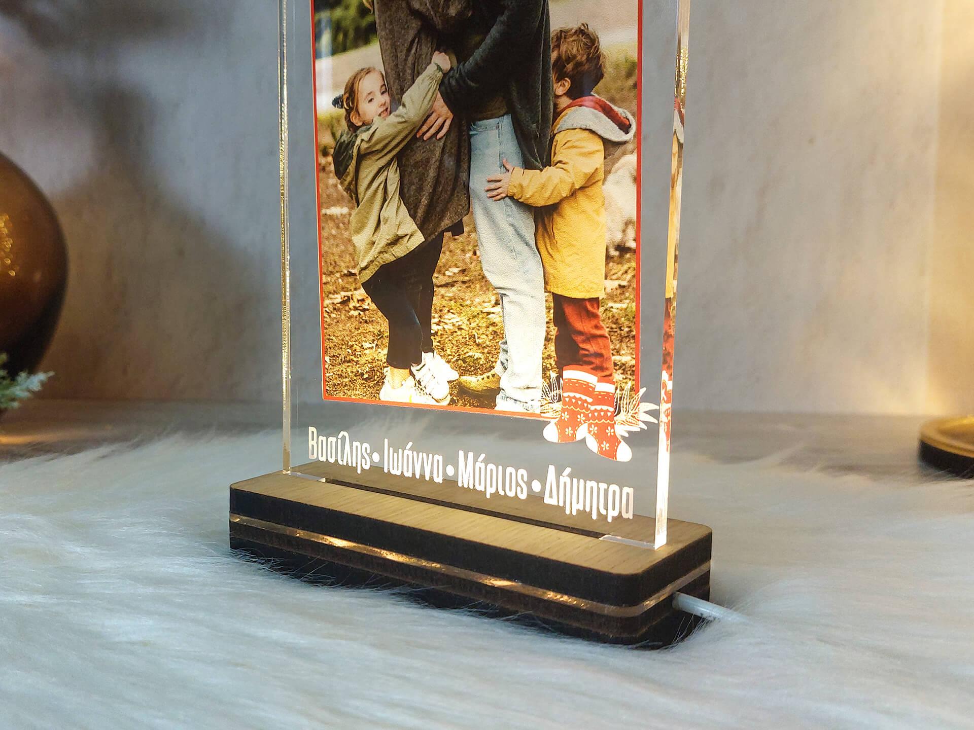 • Υλικά: Led λευκού χρώματος, Ακρυλικό διάφανο πάχους 6mm, Χειροποίητη βάση από ξύλο και ακρυλικό