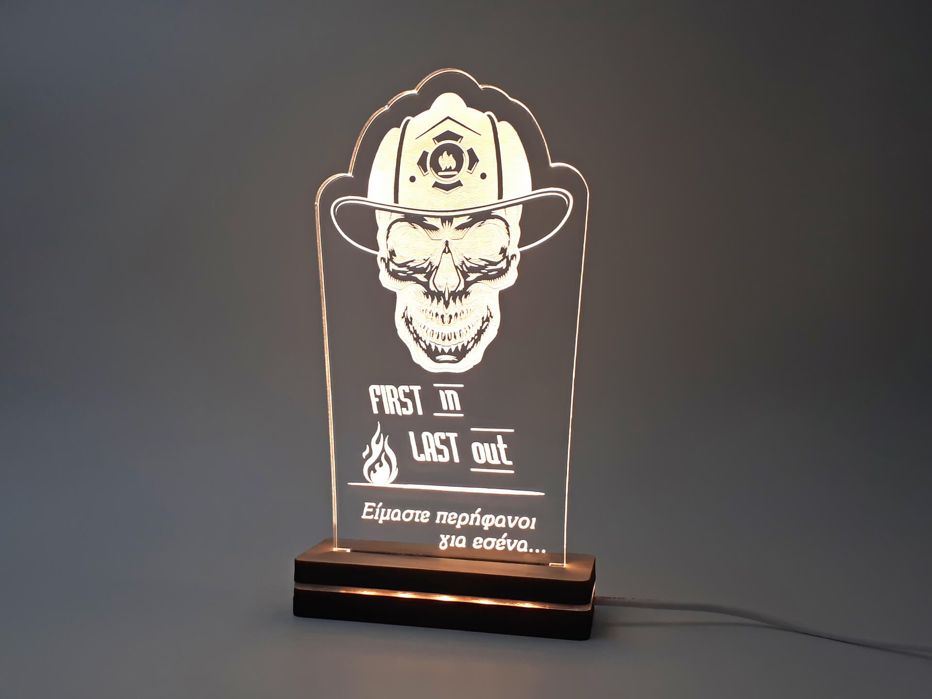Μια γλυκιά υπενθύμιση της εκτίμησης και της αγάπης μας για τους ήρωες που εργάζονται καθημερινά για να μας προστατεύουν! Φωτιστικό Led από ακρυλικό και ξύλινη χειροποίητη βάση δικής μας πρωτοποριακής σχεδίασης και κατασκευής.