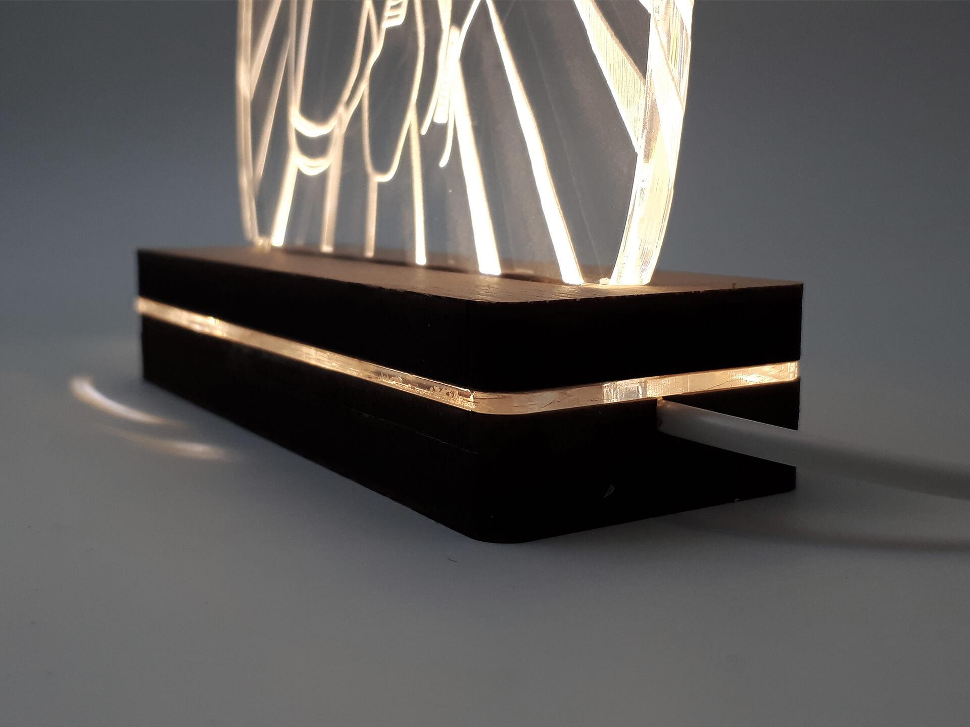 Φωτιστικό Led από ακρυλικό και ξύλινη χειροποίητη βάση δικής μας πρωτοποριακής σχεδίασης και κατασκευής.