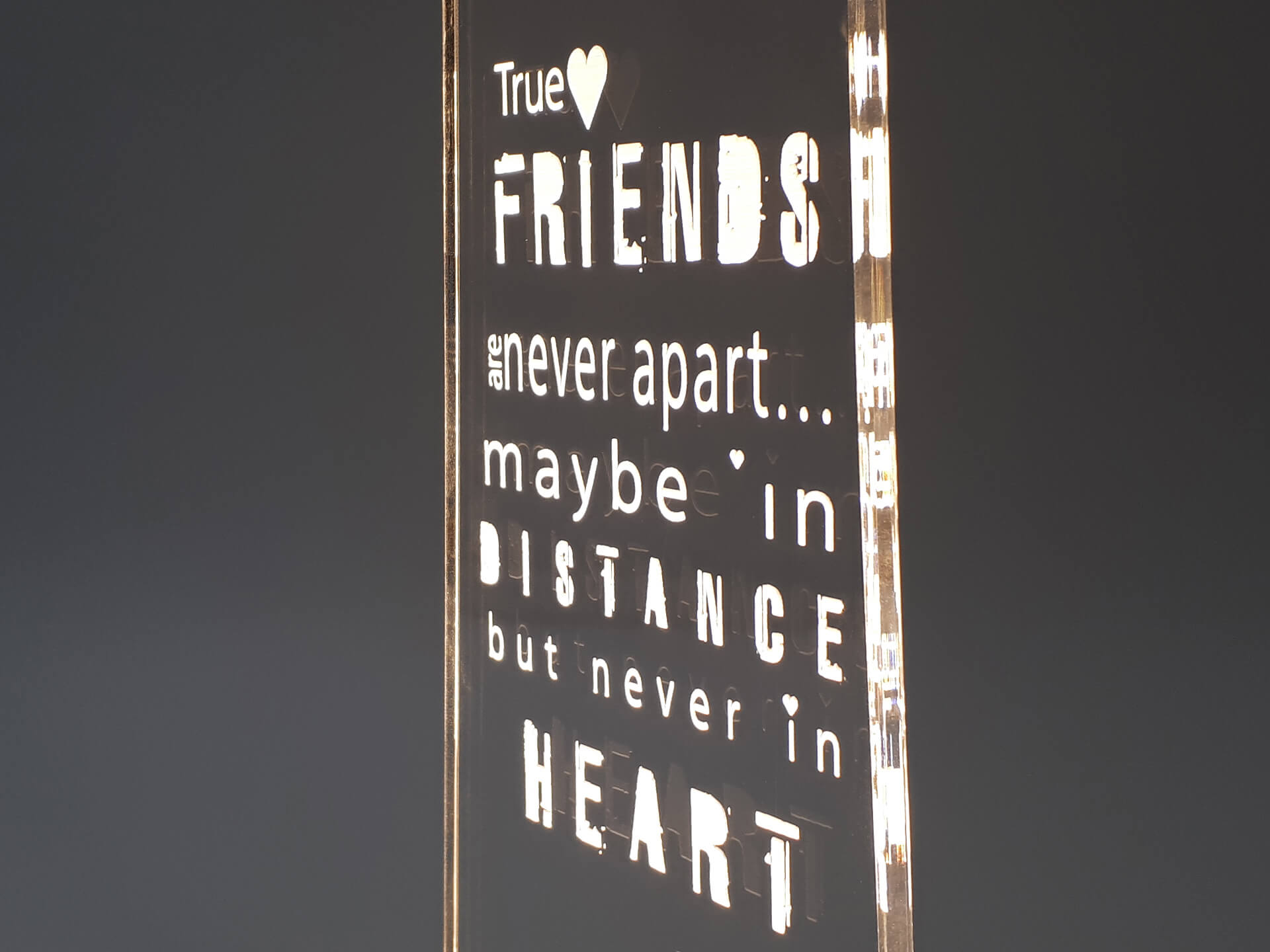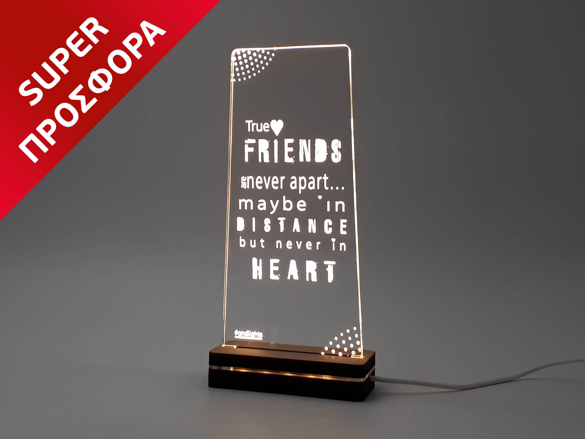 Φωτιστικό Led από ακρυλικό, με χάραξη τη φράση "True friends are never apart…maybe in distance but never in heart" και ξύλινη χειροποίητη βάση δικής μας πρωτοποριακής σχεδίασης και κατασκευής.