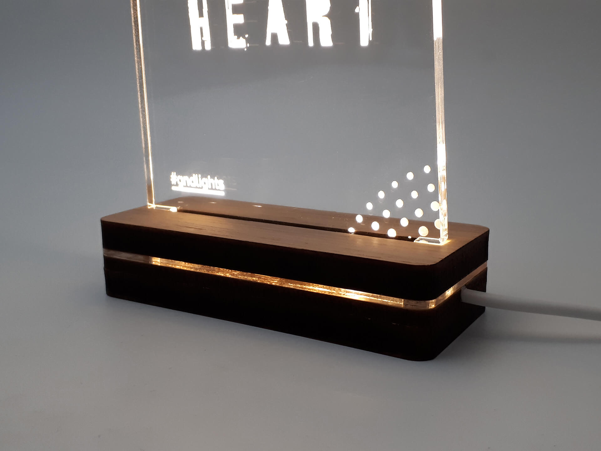 • Υλικά: Led λευκού χρώματος, Ακρυλικό διάφανο πάχους 6mm, Χειροποίητη βάση από ξύλο και ακρυλικό