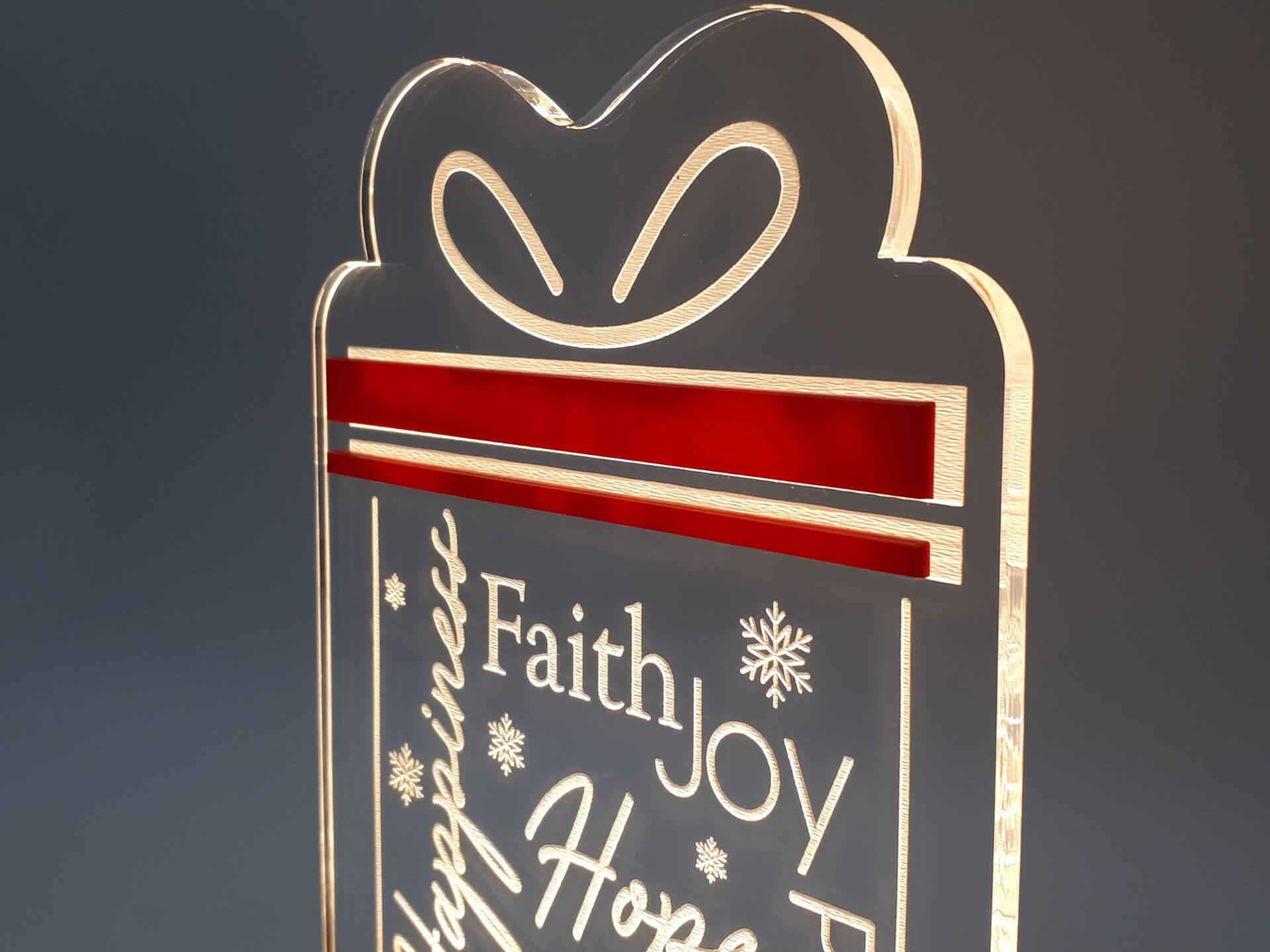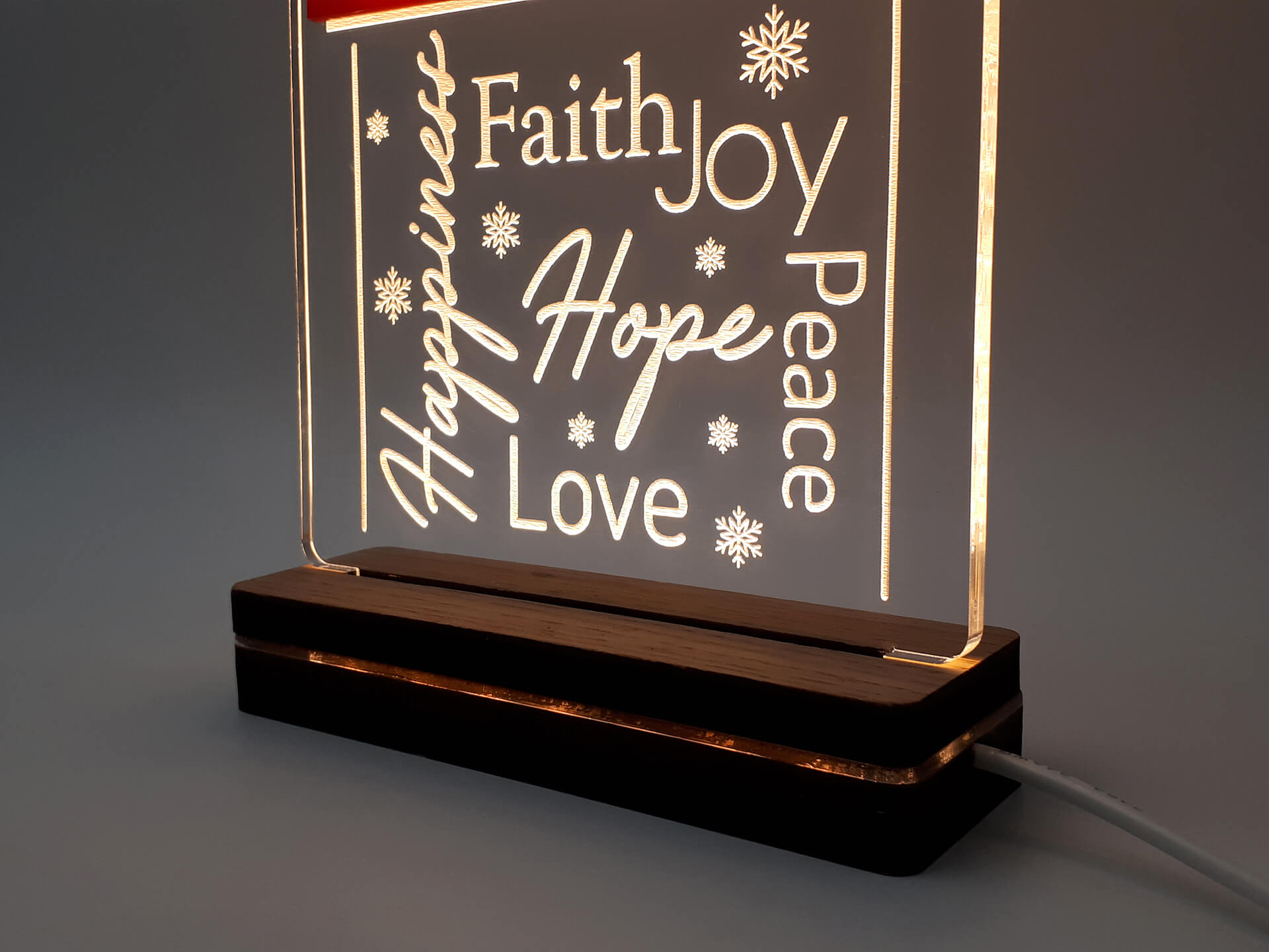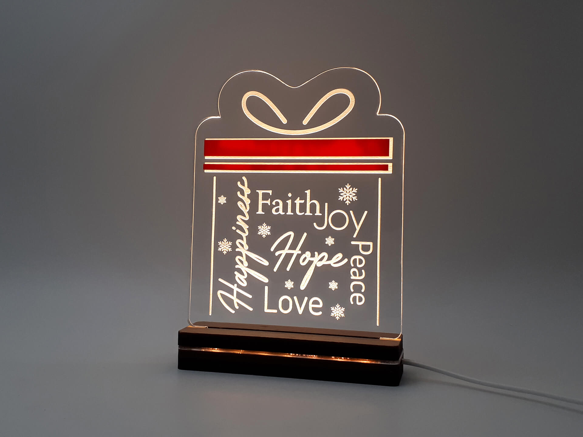 • Υλικά: Led λευκού χρώματος, Ακρυλικό διάφανο πάχους 6mm, Ακρυλικό κόκκινο πάχους 3mm, Χειροποίητη βάση από ξύλο και ακρυλικό