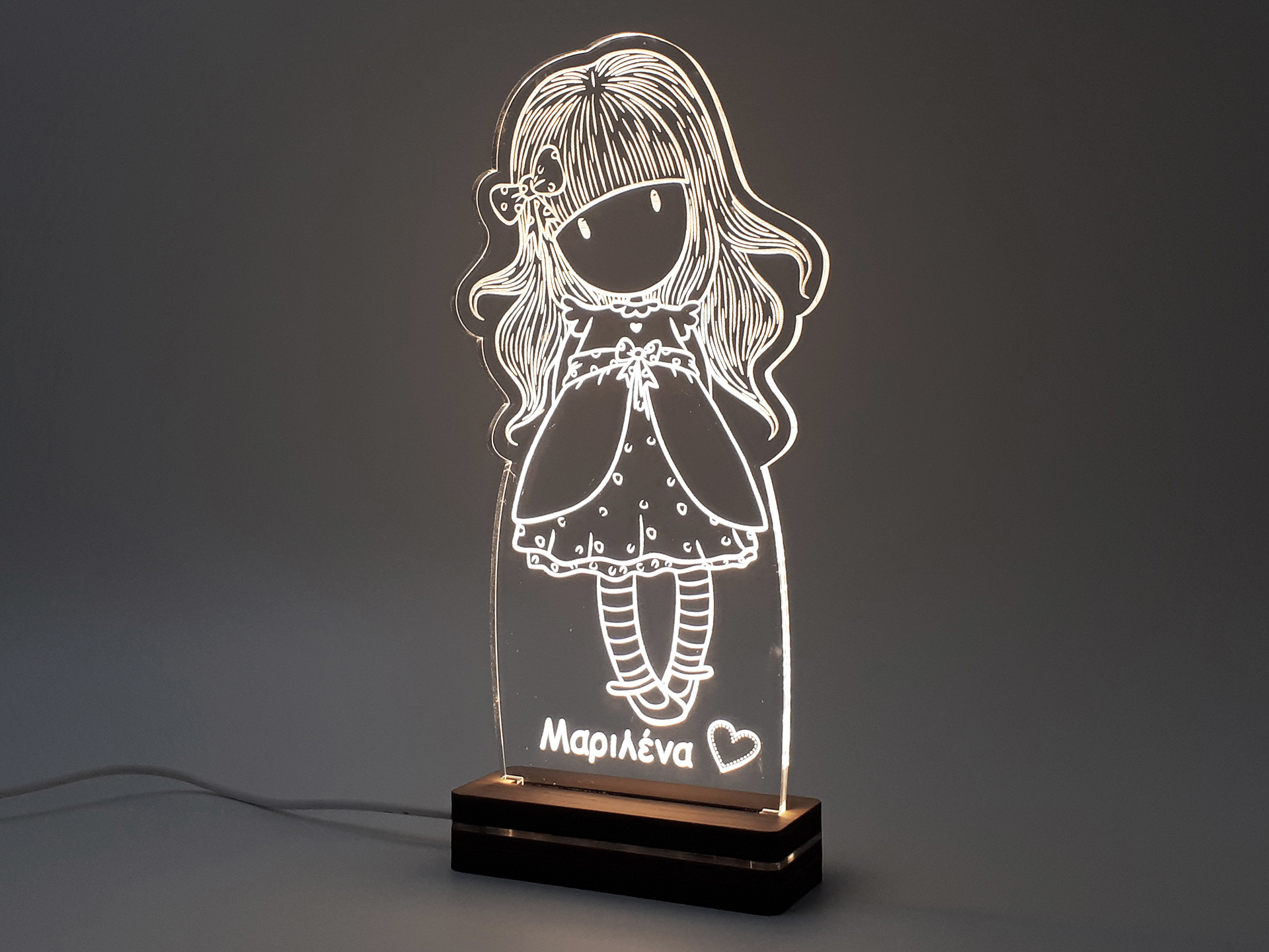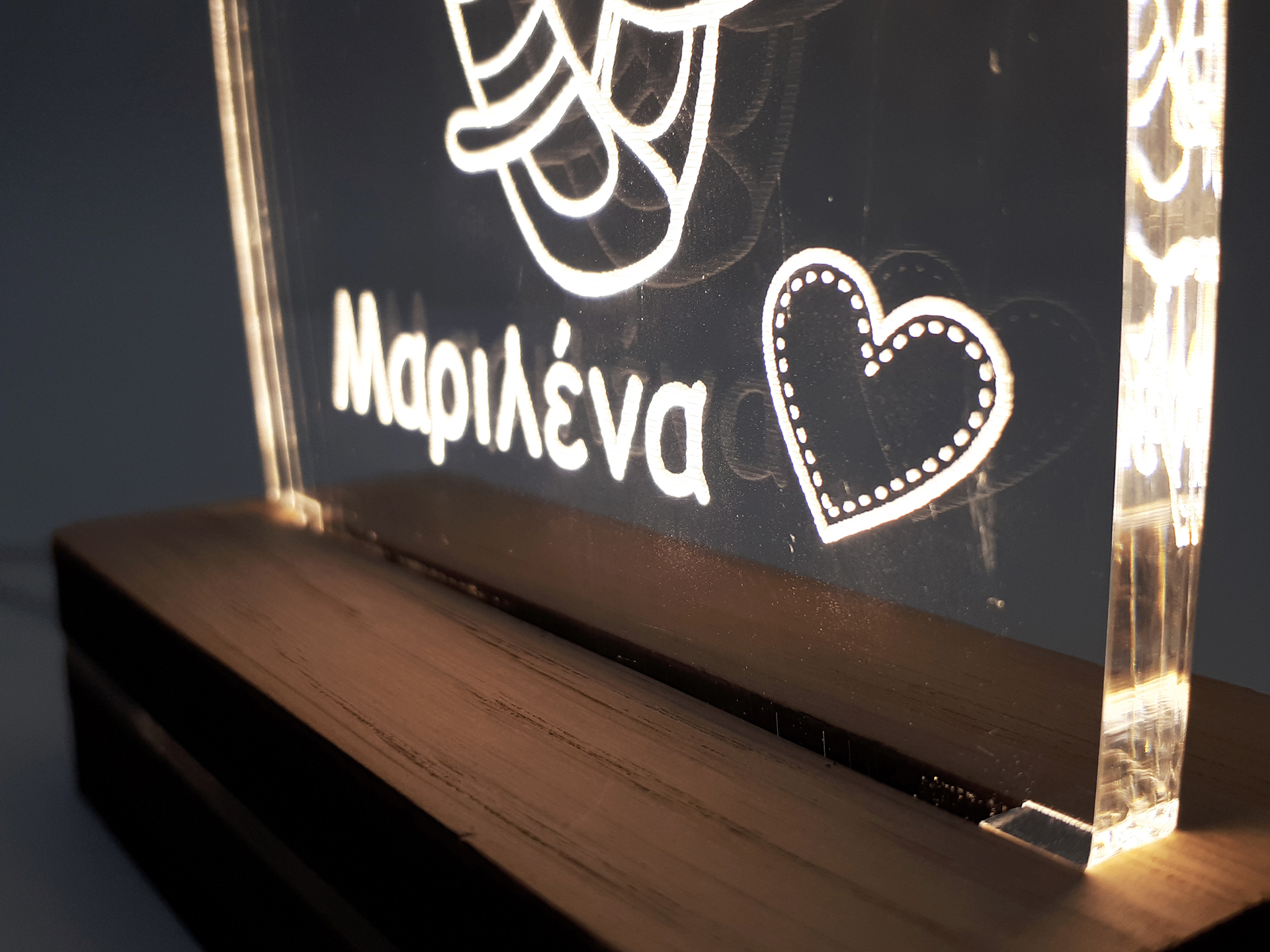 • Υλικά: Led λευκού χρώματος, Ακρυλικό διάφανο πάχους 6mm, Χειροποίητη βάση από ξύλο και ακρυλικό