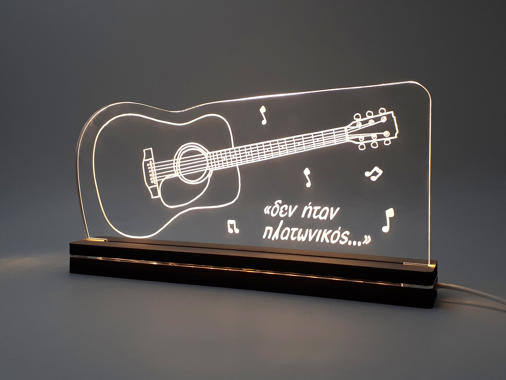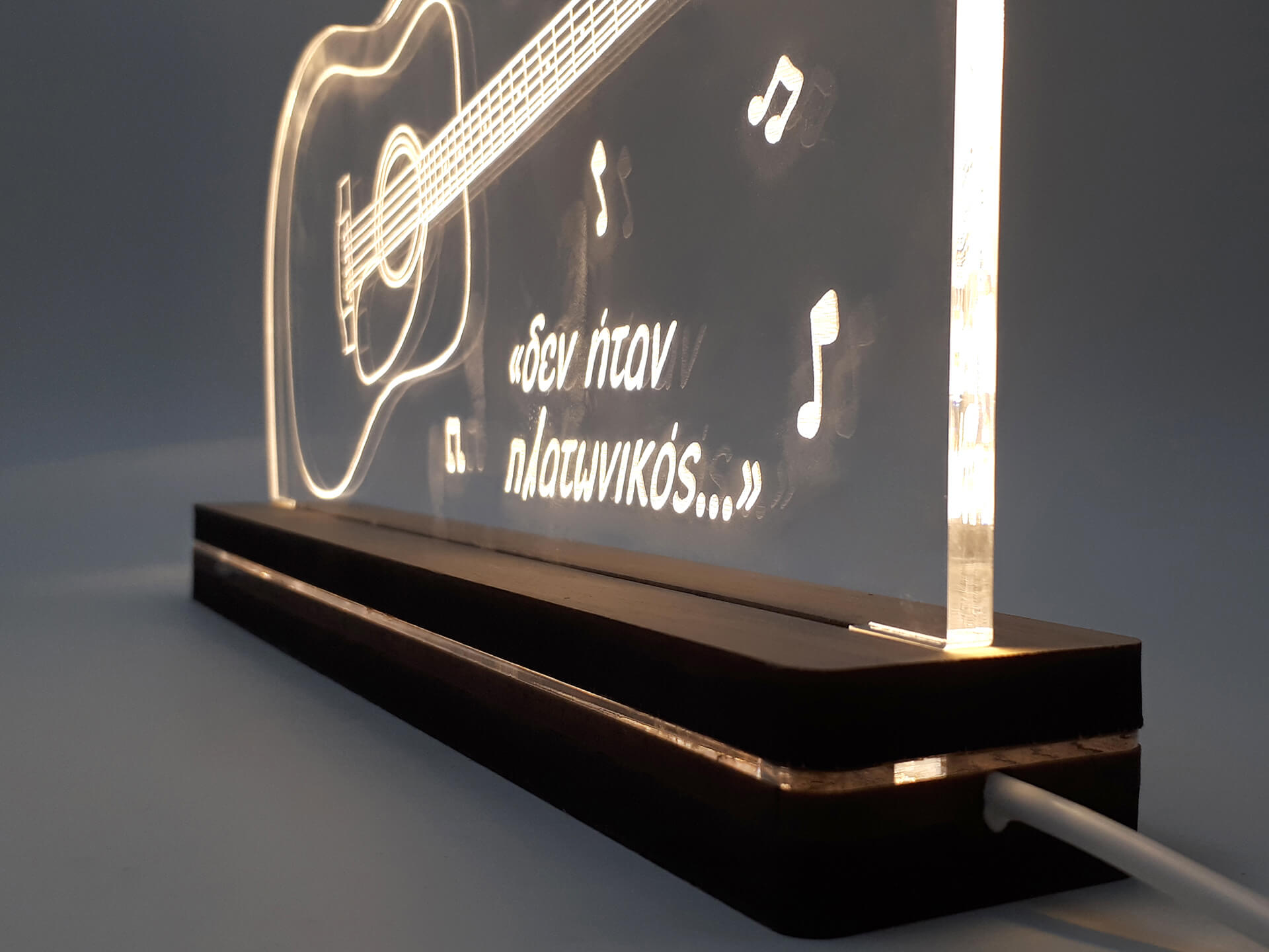 • Υλικά: Led λευκού χρώματος, Ακρυλικό διάφανο πάχους 6mm, Χειροποίητη βάση από ξύλο και ακρυλικό