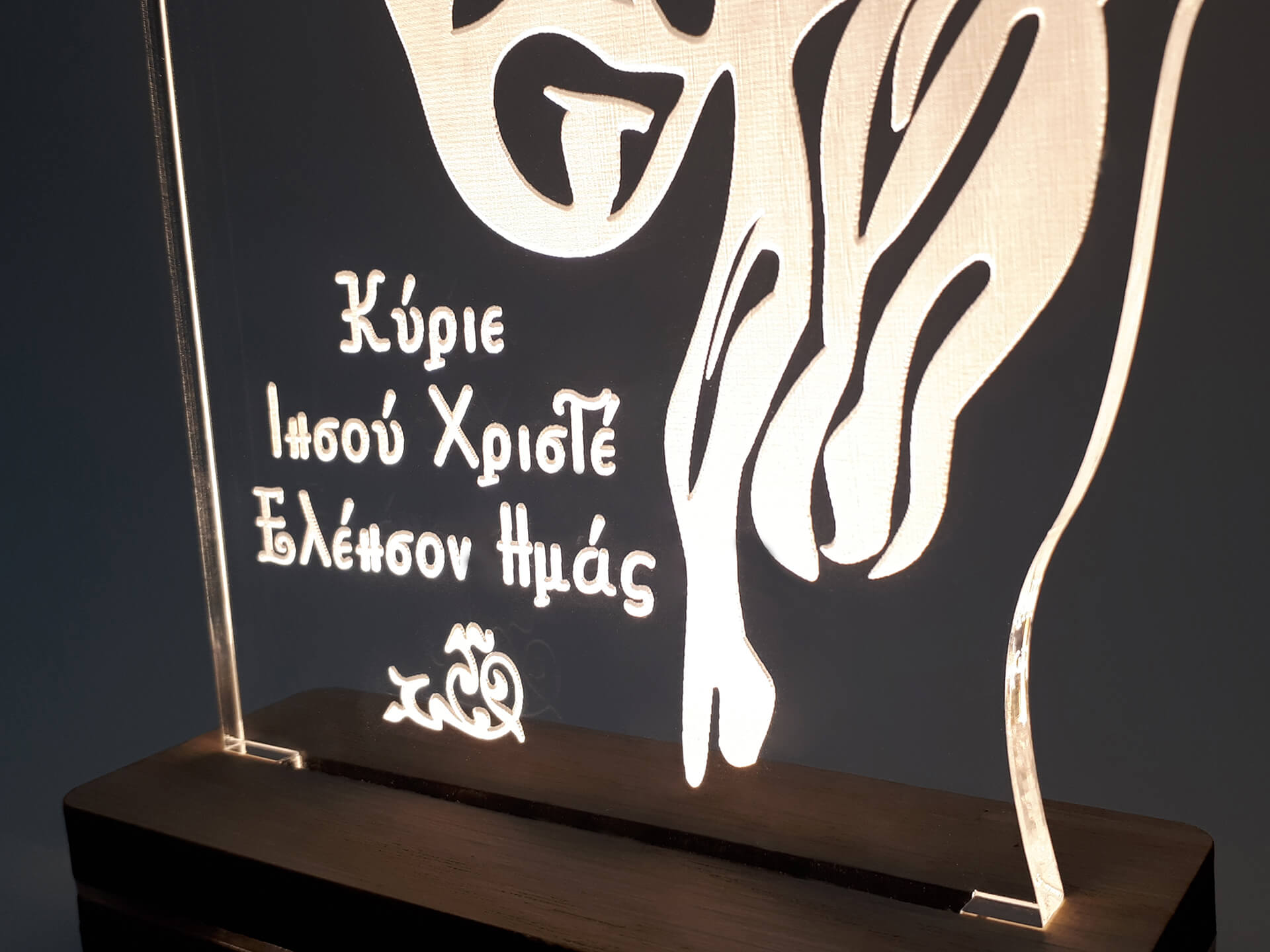 • Υλικά: Led λευκού χρώματος, Ακρυλικό διάφανο πάχους 6mm, Χειροποίητη βάση από ξύλο και ακρυλικό