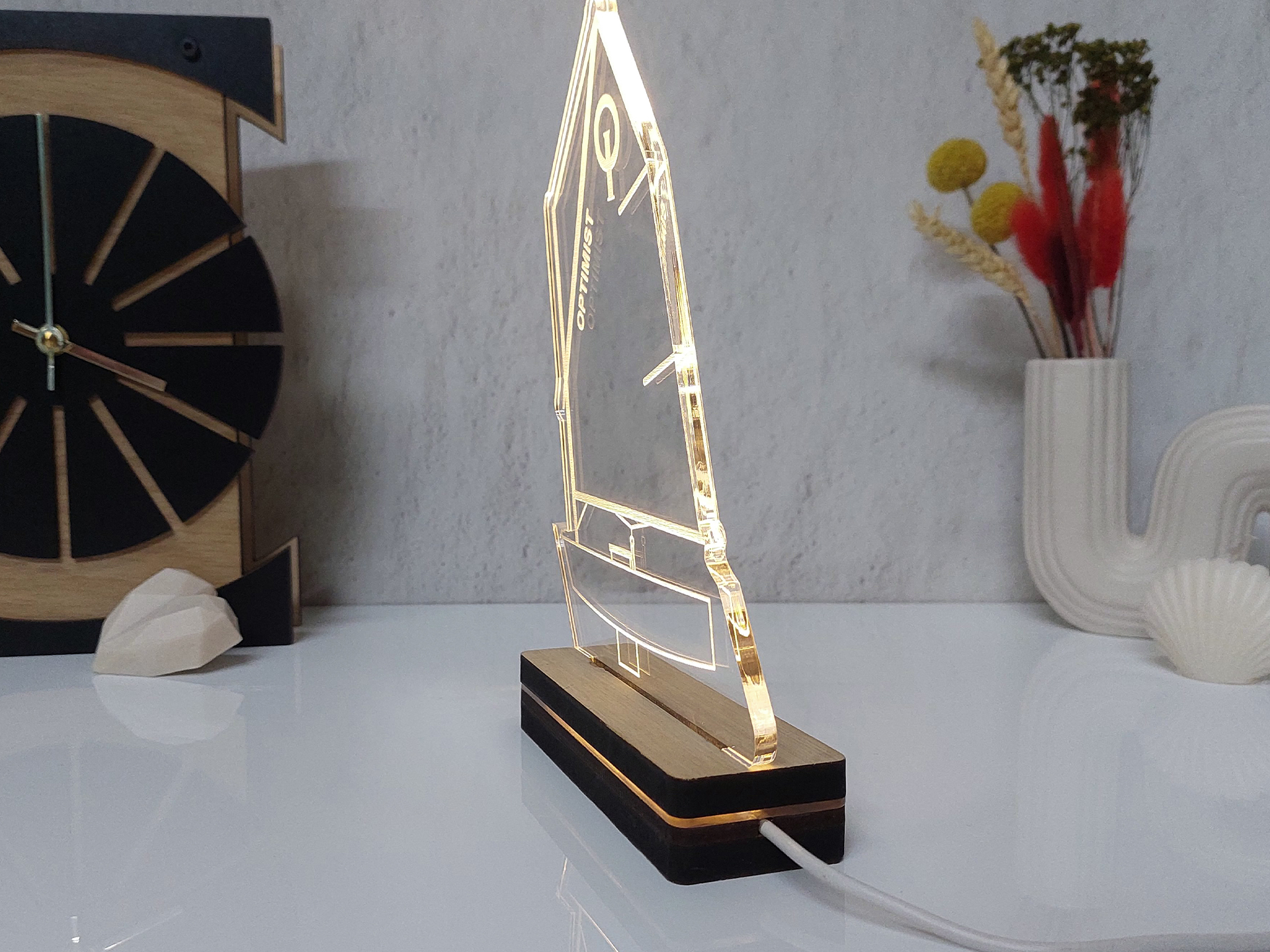 • Υλικά: Led λευκού χρώματος, Ακρυλικό διάφανο πάχους 6mm, Χειροποίητη βάση από ξύλο και ακρυλικό