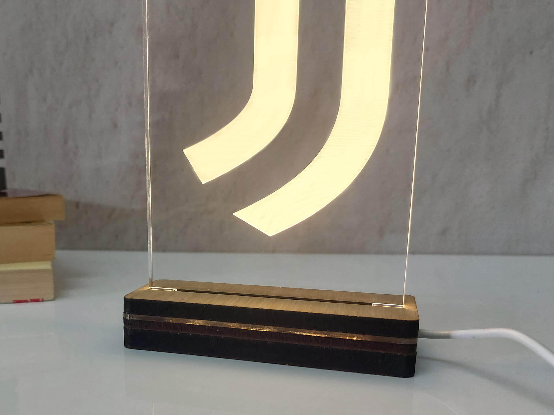 Φωτιστικό Led από ακρυλικό και ξύλινη χειροποίητη βάση δικής μας πρωτοποριακής σχεδίασης και κατασκευής.