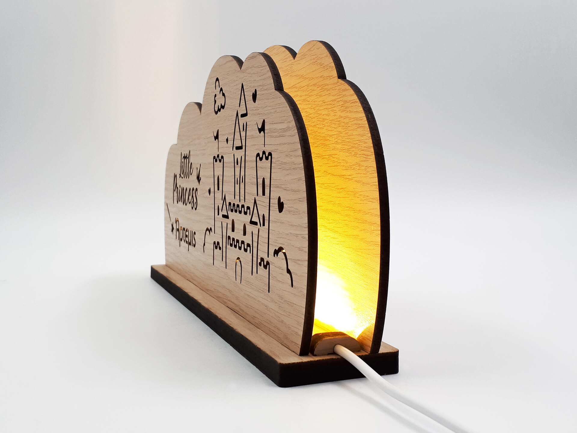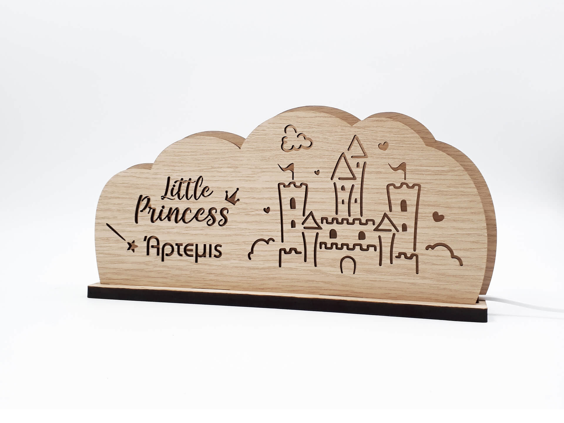 • Υλικά: Led λευκού χρώματος, Ξύλο πάχους 4mm, Χειροποίητη βάση από ξύλο