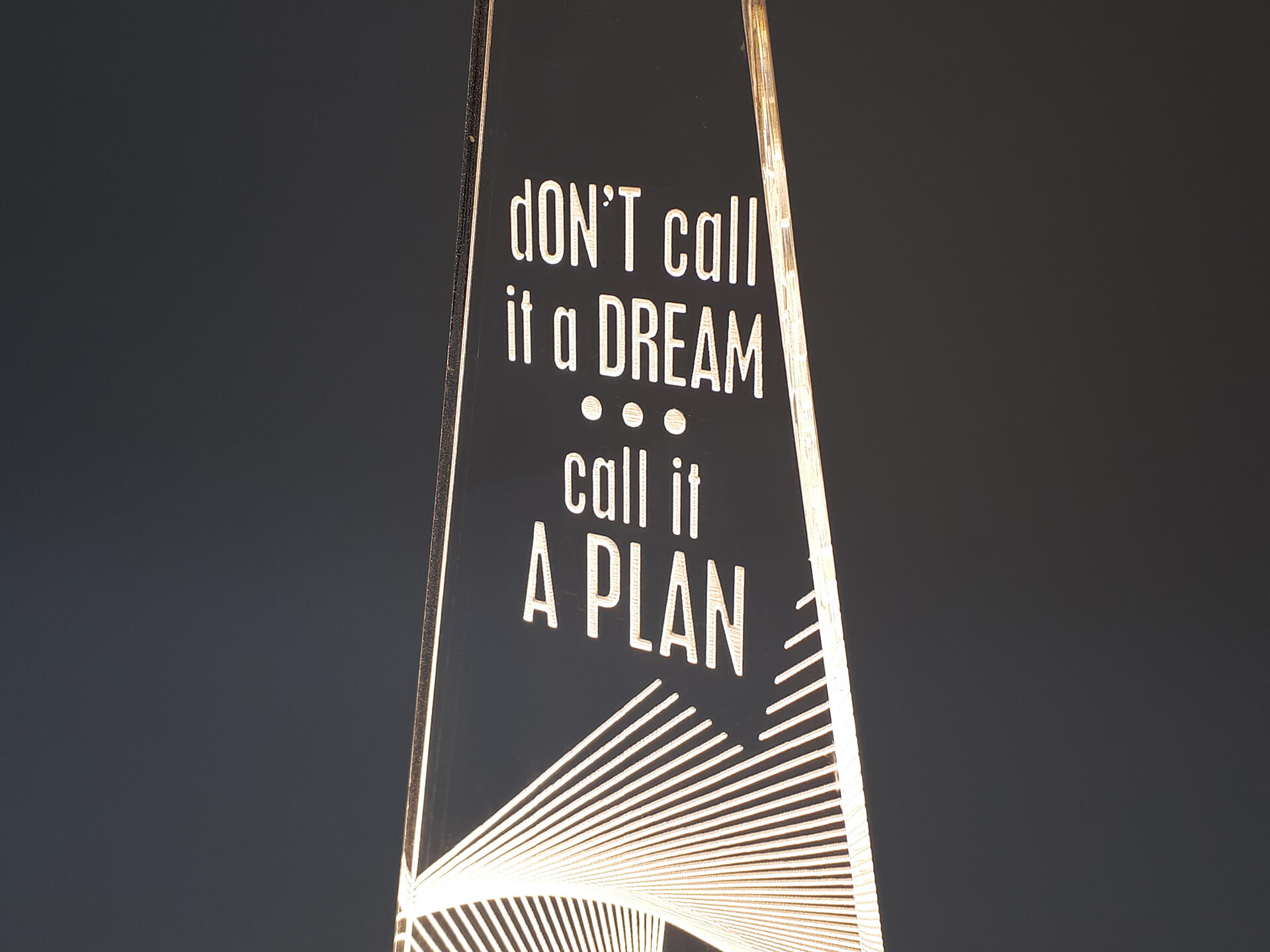 Φωτιστικό Led από ακρυλικό, με χάραξη τη φράση "Don't call it a dream…call it a plan" και ξύλινη χειροποίητη βάση δικής μας πρωτοποριακής σχεδίασης και κατασκευής.