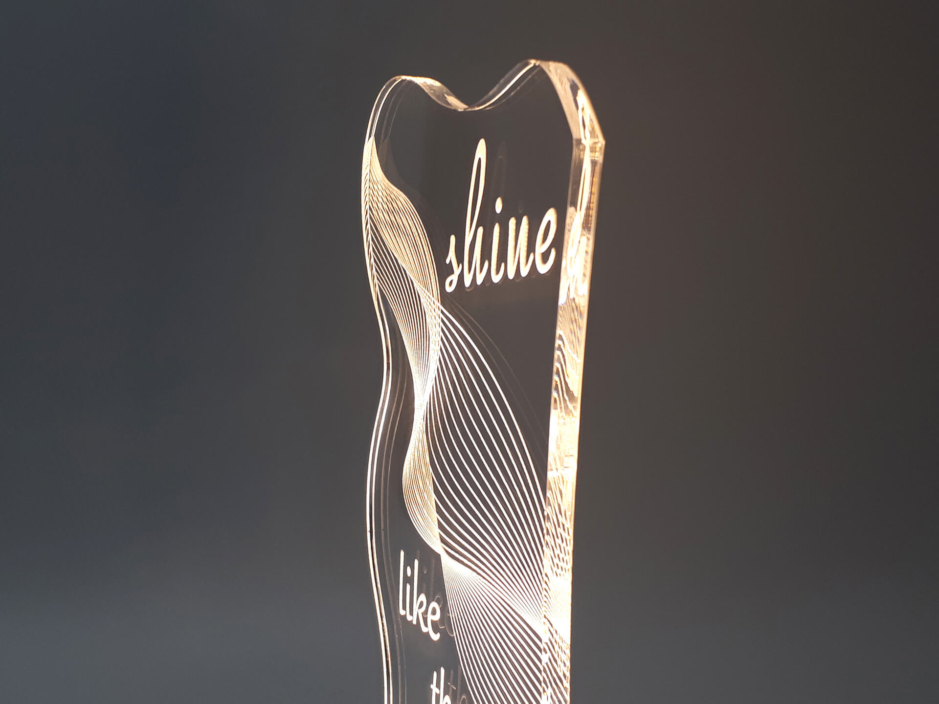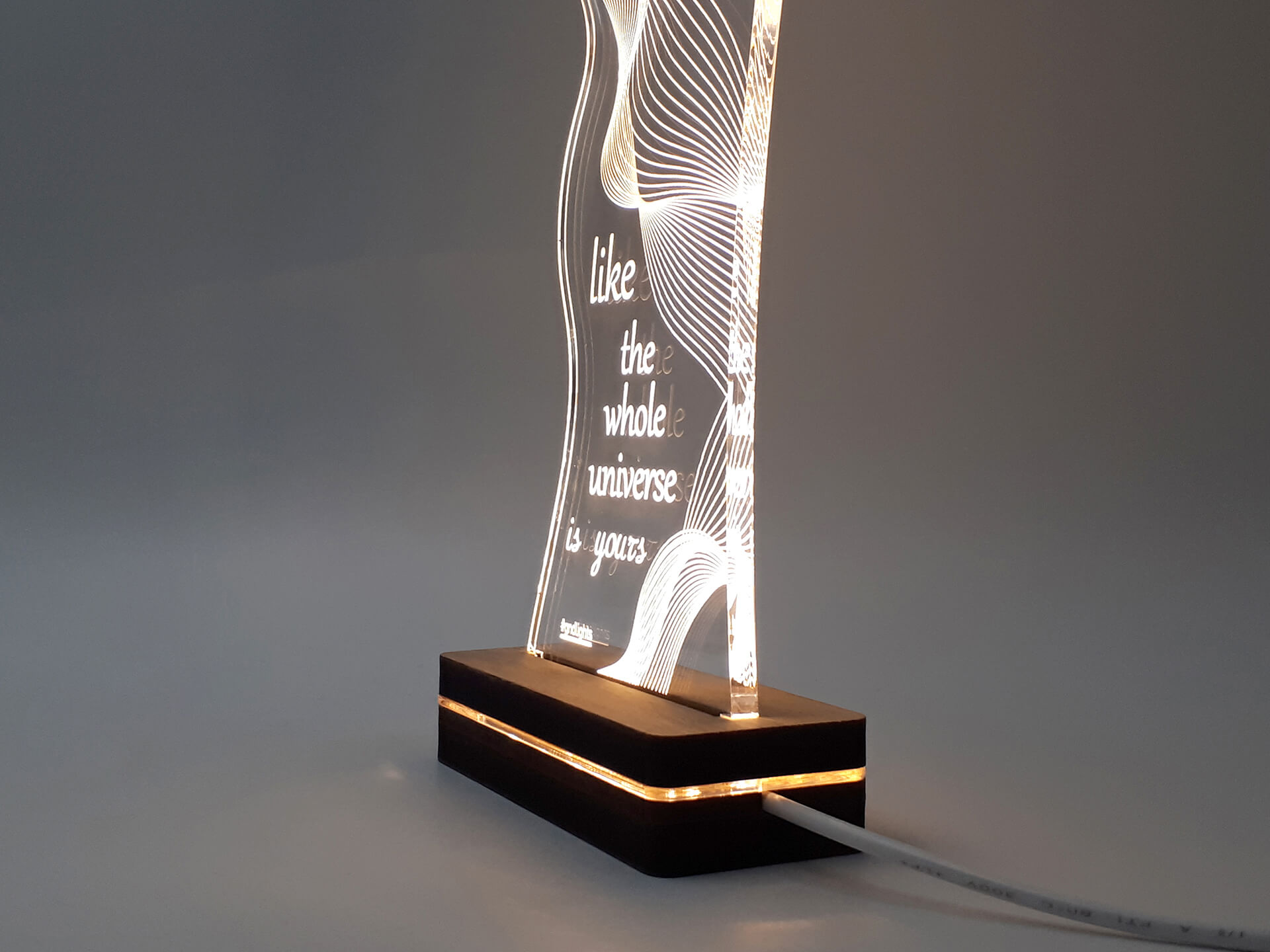 Φωτιστικό Led από ακρυλικό, με χάραξη τη φράση "Shine like the whole universe is yours" και ξύλινη χειροποίητη βάση δικής μας πρωτοποριακής σχεδίασης και κατασκευής.