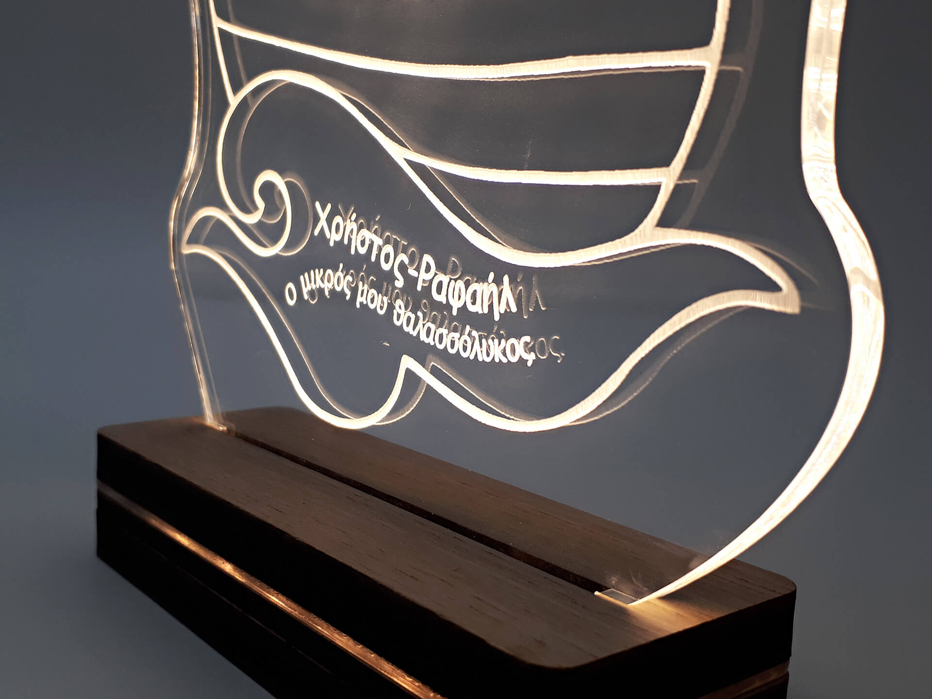• Υλικά: Led λευκού χρώματος, Ακρυλικό διάφανο πάχους 6mm, Χειροποίητη βάση από ξύλο και ακρυλικό