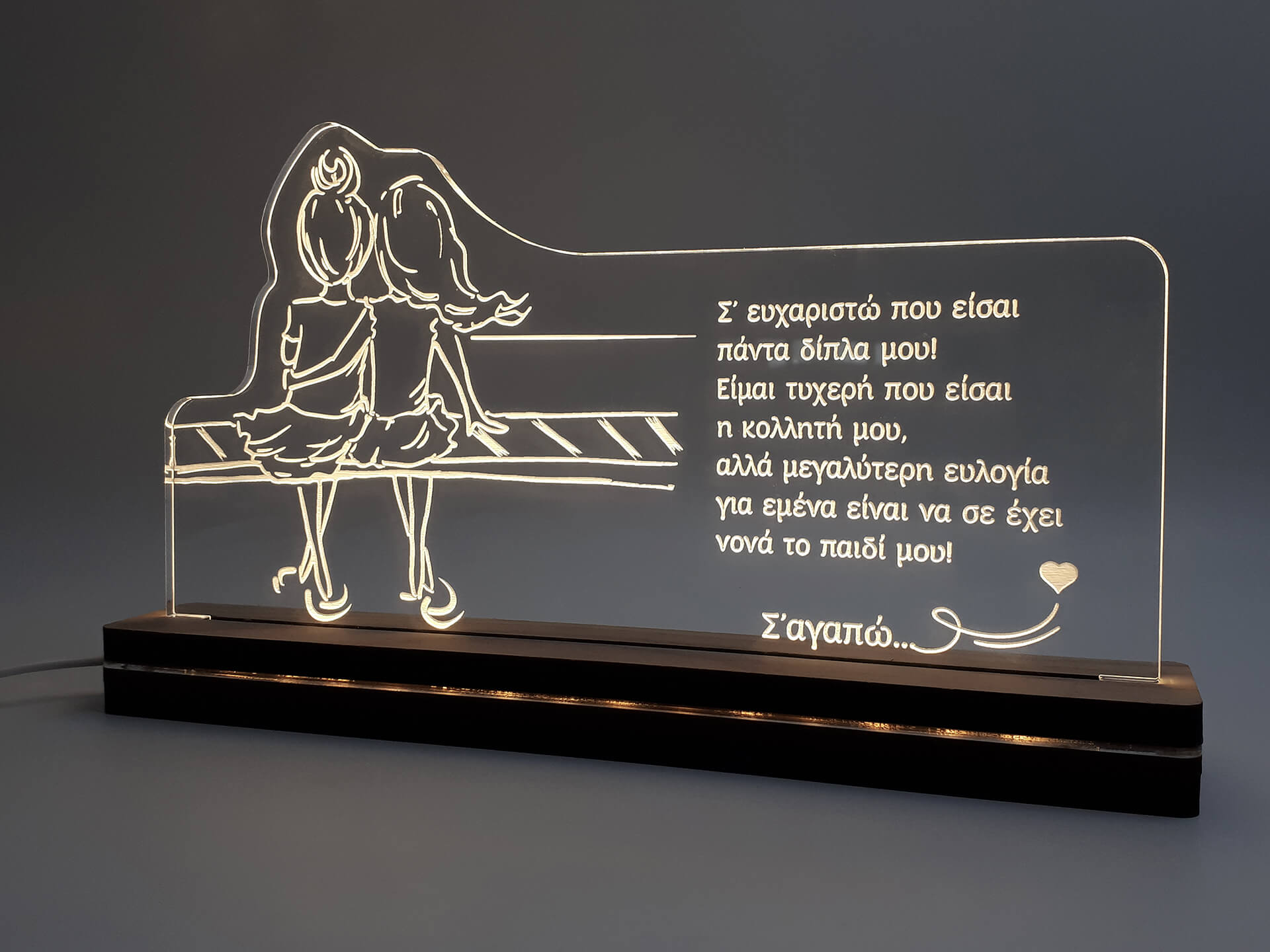 • Υλικά: Led λευκού χρώματος, Ακρυλικό διάφανο πάχους 6mm, Χειροποίητη βάση από ξύλο και ακρυλικό