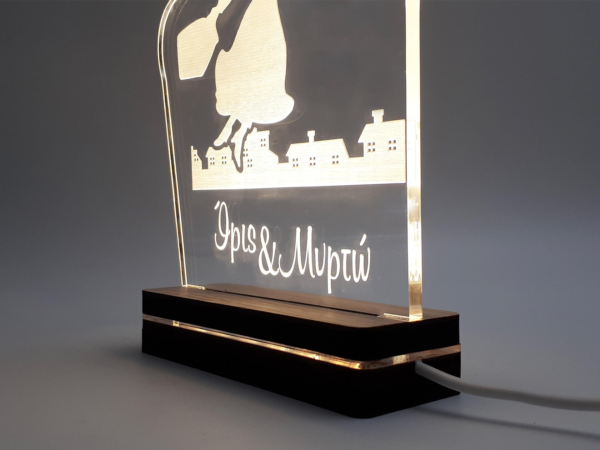 • Υλικά: Led λευκού χρώματος, ακρυλικό διάφανο πάχους 6mm, Χειροποίητη βάση από ξύλο και ακρυλικό
