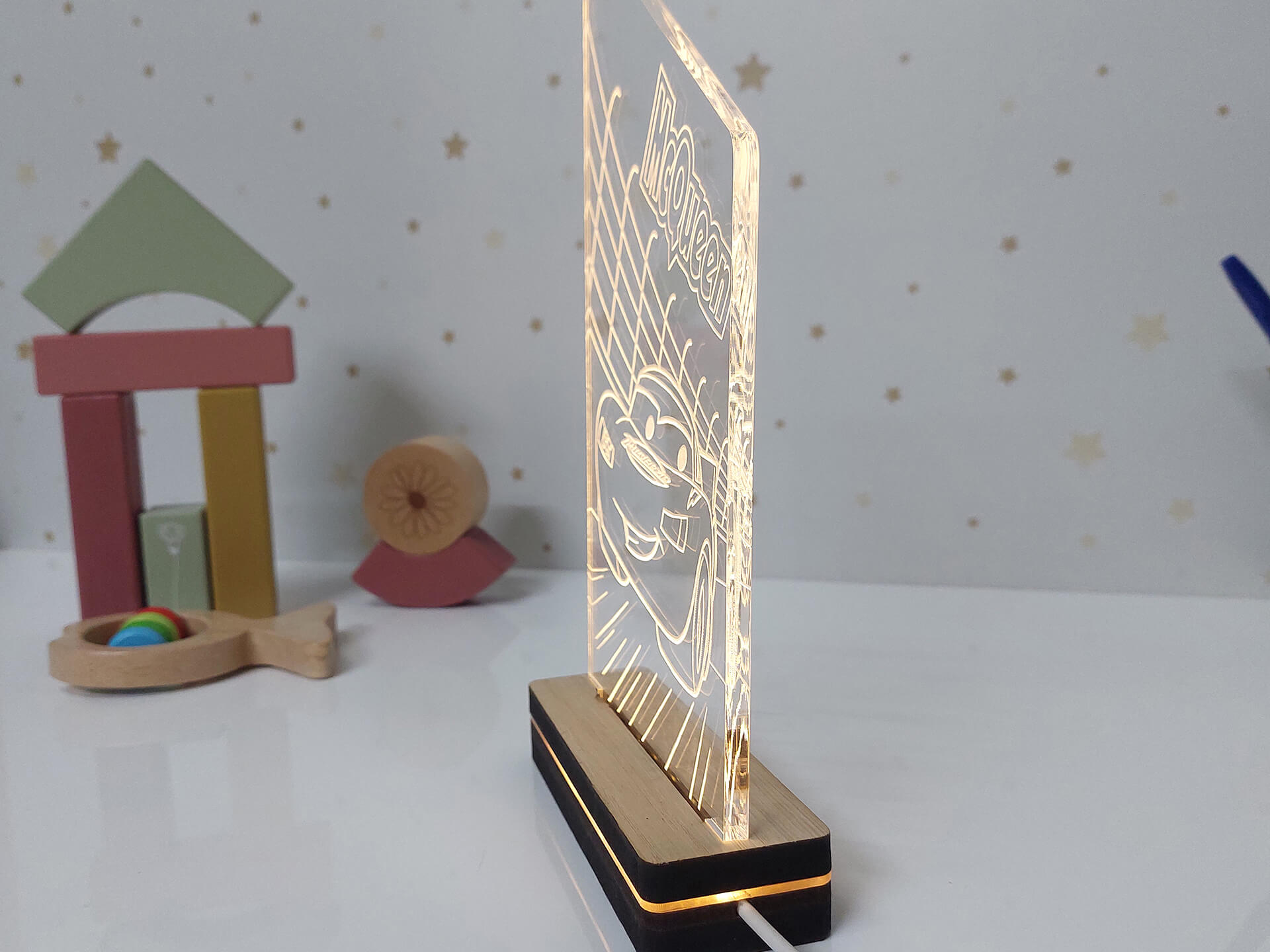 • Υλικά: Led λευκού χρώματος, Ακρυλικό διάφανο πάχους 6mm, Χειροποίητη βάση από ξύλο και ακρυλικό