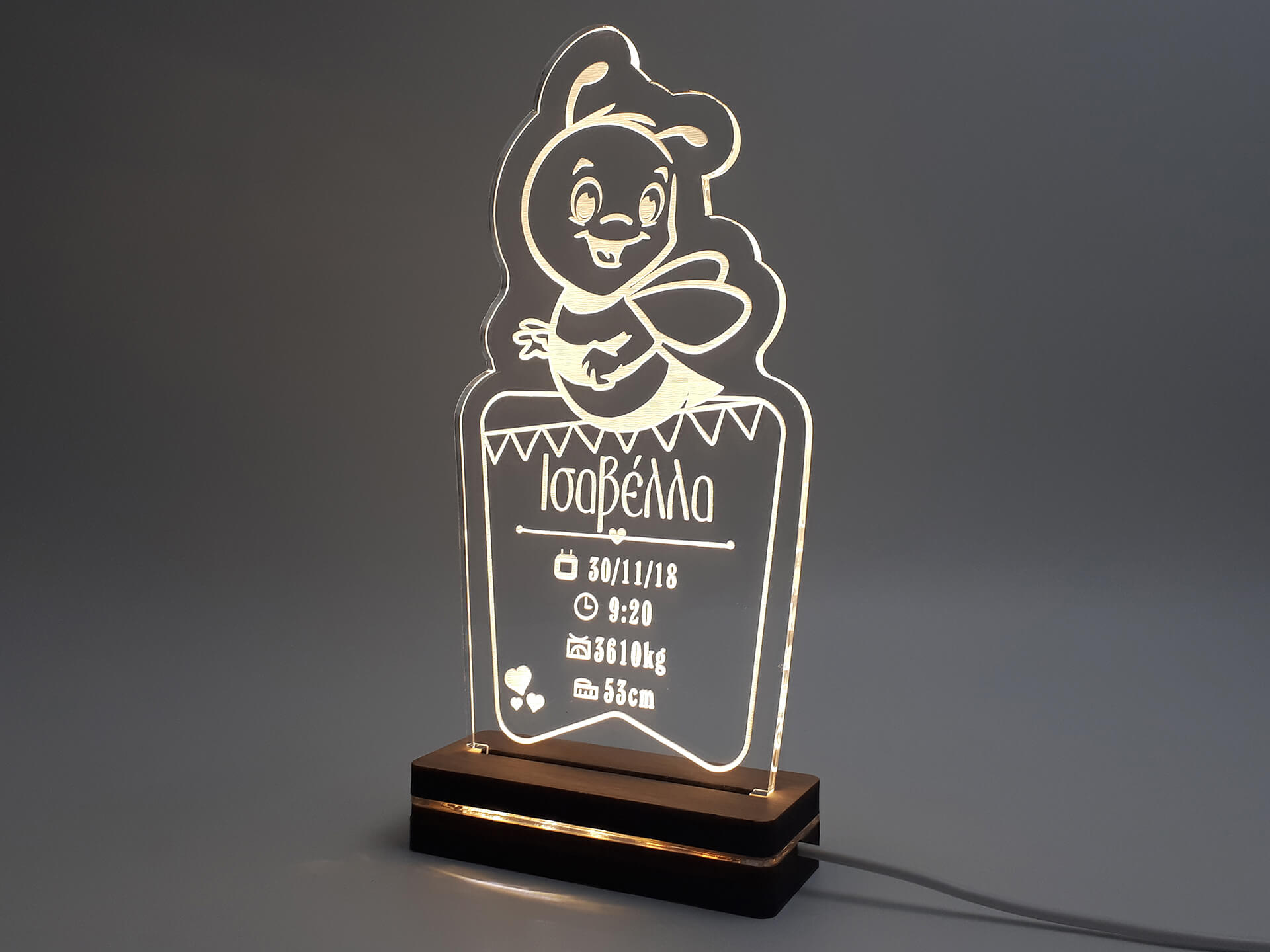 Κρατήστε τα στοιχεία γέννησης του μωρού σας φωτεινά! Πρωτότυπο φωτιστικό μελισσούλα για να διακοσμήσετε το δωμάτιο του μωρού σας ή μπορείτε να το κάνετε δώρο σε νέους γονείς με τον ερχομό του νέου μέλους!