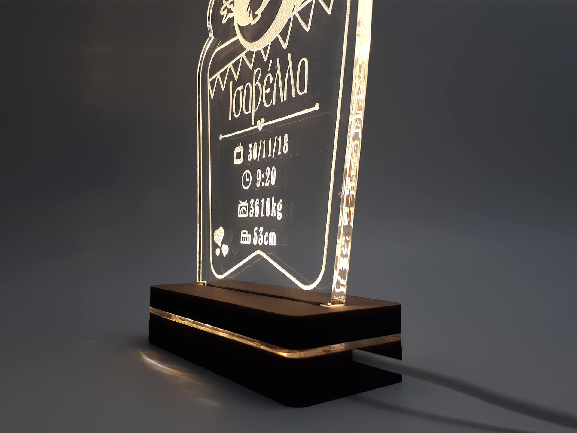 • Υλικά: Led λευκού χρώματος, Ακρυλικό διάφανο πάχους 6mm, Χειροποίητη βάση από ξύλο και ακρυλικό