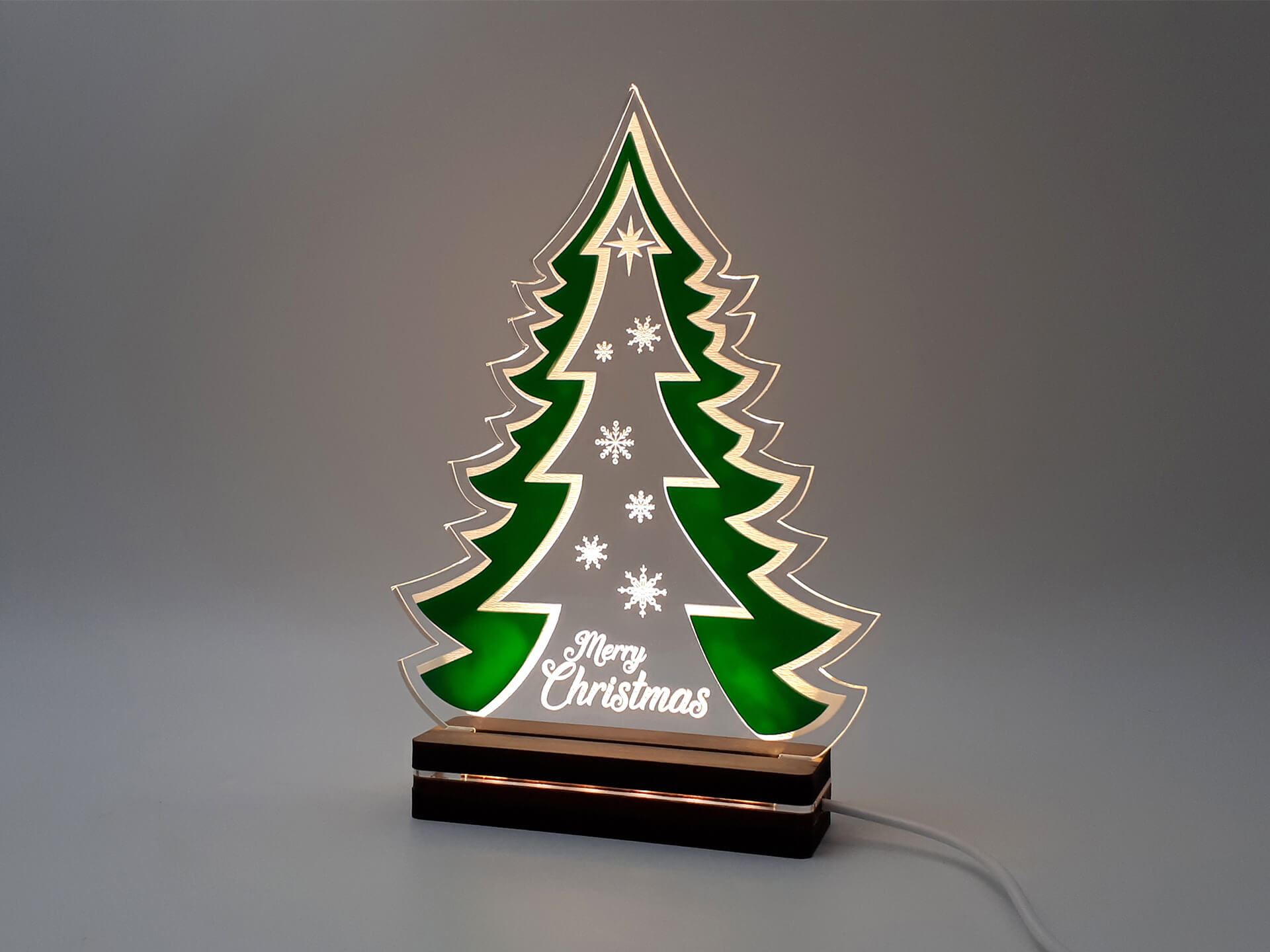 • Υλικά: Led λευκού χρώματος, Ακρυλικό διάφανο πάχους 6mm, Ακρυλικό πράσινο πάχους 3mm, Χειροποίητη βάση από ξύλο και ακρυλικό