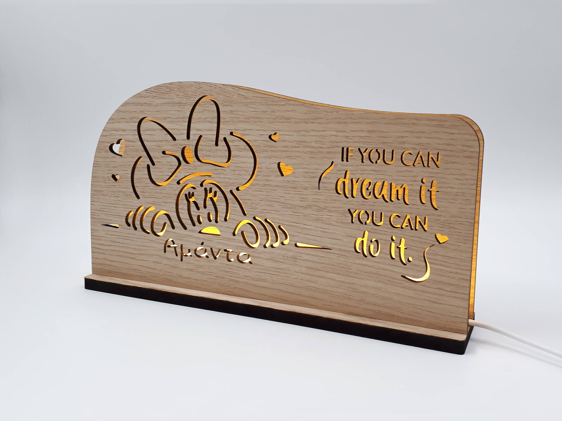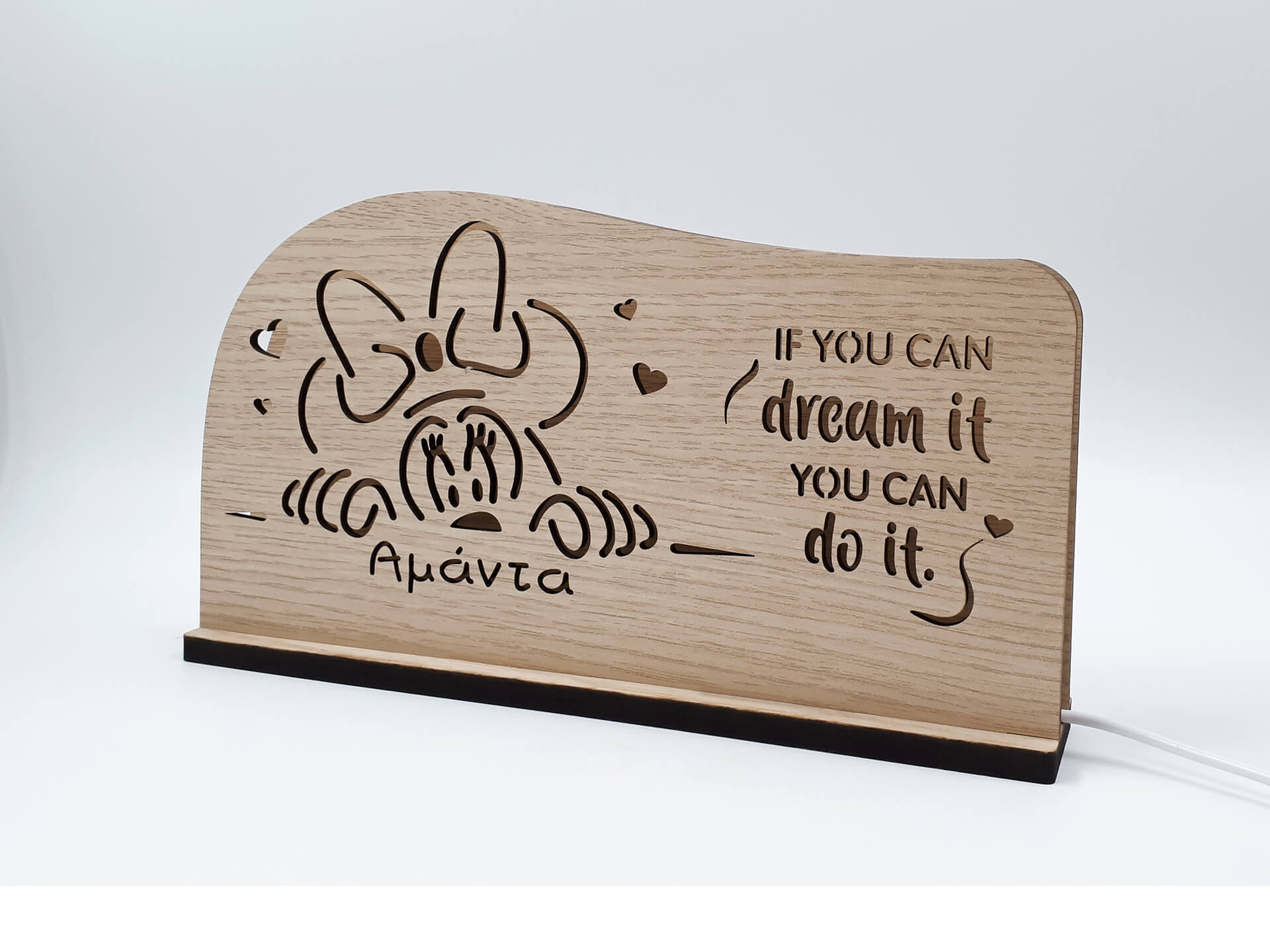• Υλικά: Led λευκού χρώματος, Ξύλο πάχους 4mm, Χειροποίητη βάση από ξύλο