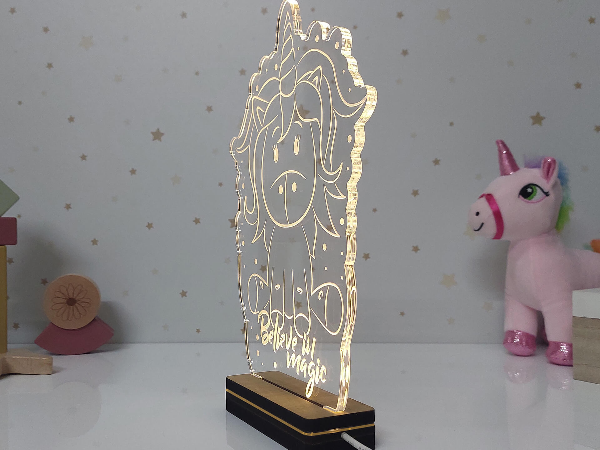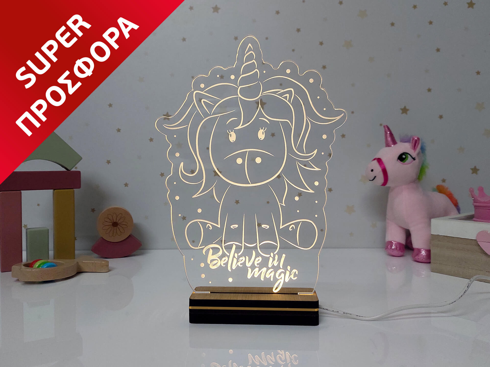 • Υλικά: Led λευκού χρώματος, Ακρυλικό διάφανο πάχους 6mm, Χειροποίητη βάση από ξύλο και ακρυλικό