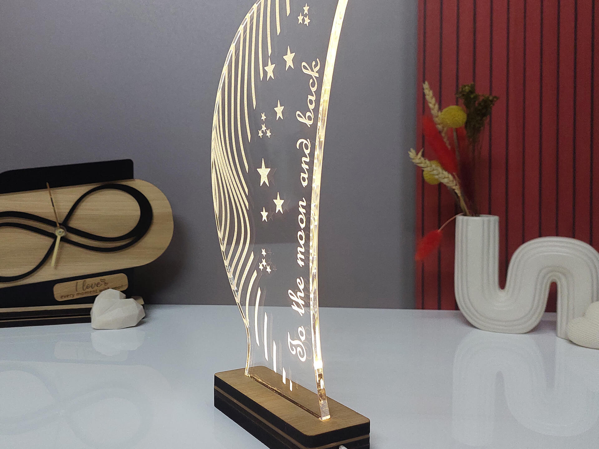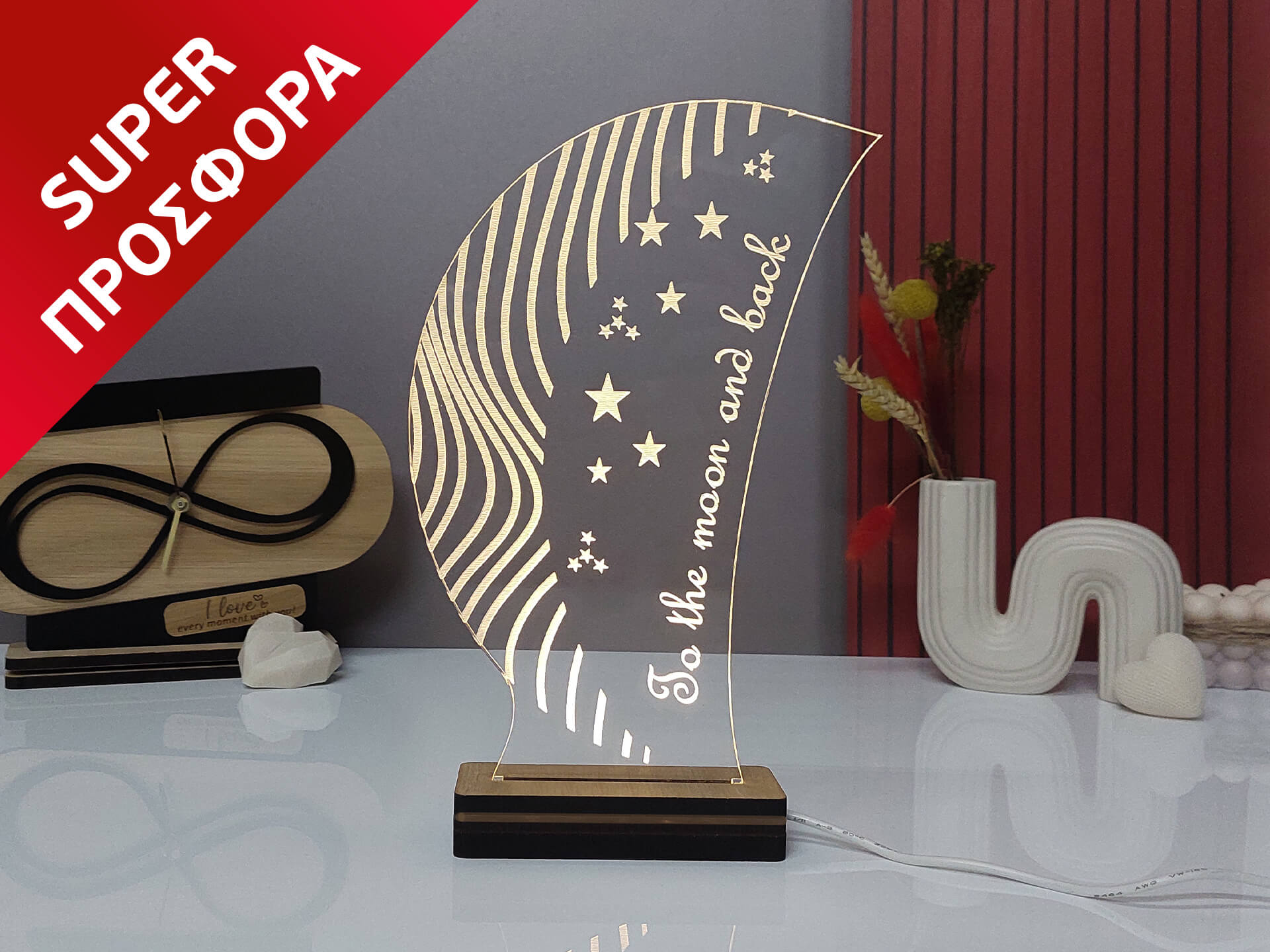 • Υλικά: Led λευκού χρώματος, Ακρυλικό διάφανο πάχους 6mm, Χειροποίητη βάση από ξύλο και ακρυλικό