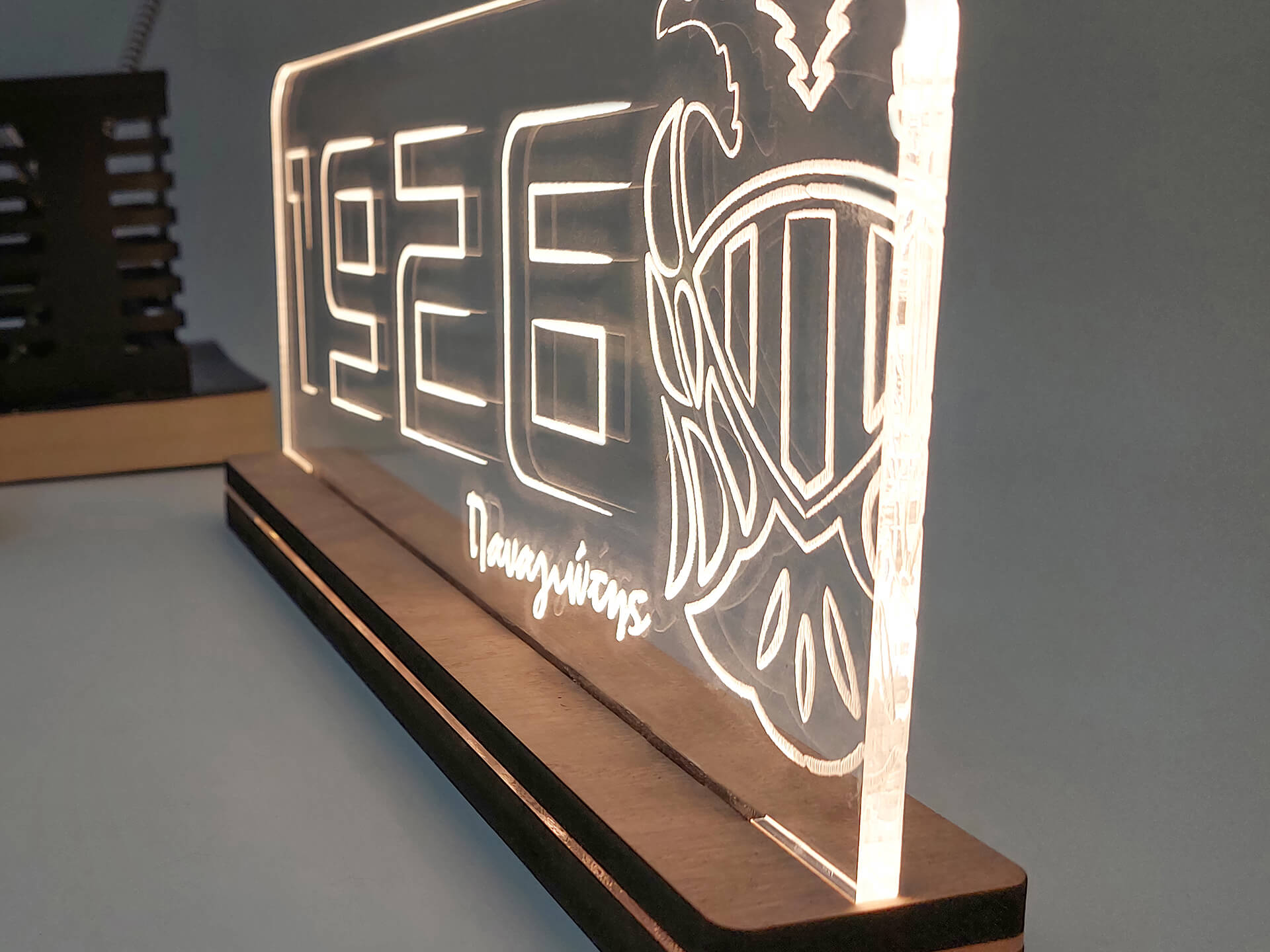 Φωτιστικό Led από ακρυλικό και ξύλινη χειροποίητη βάση δικής μας πρωτοποριακής σχεδίασης και κατασκευής.