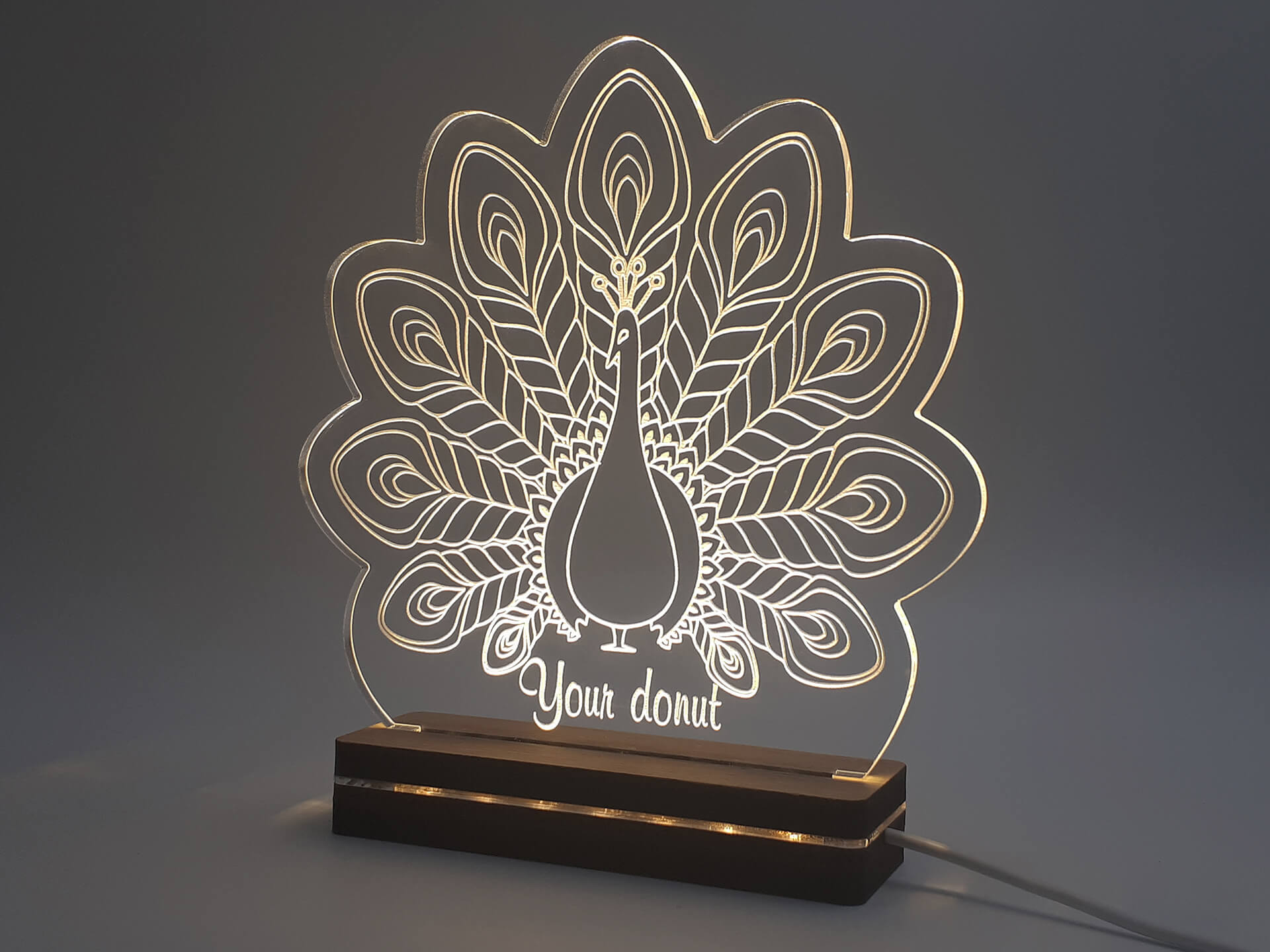 • Υλικά: Led λευκού χρώματος, Ακρυλικό διάφανο πάχους 6mm, Χειροποίητη βάση από ξύλο και ακρυλικό