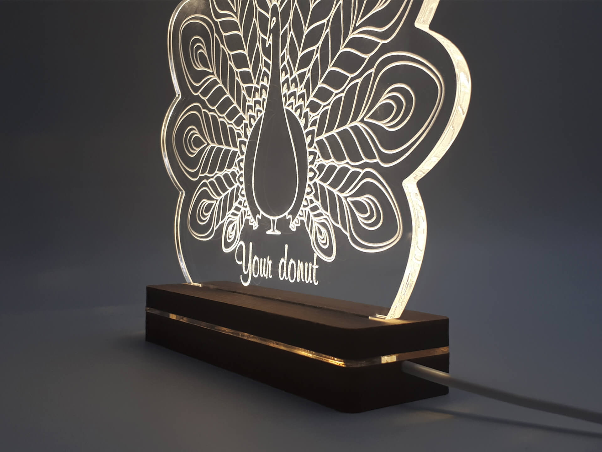 Φωτιστικό Led από ακρυλικό και ξύλινη χειροποίητη βάση δικής μας πρωτοποριακής σχεδίασης και κατασκευής.