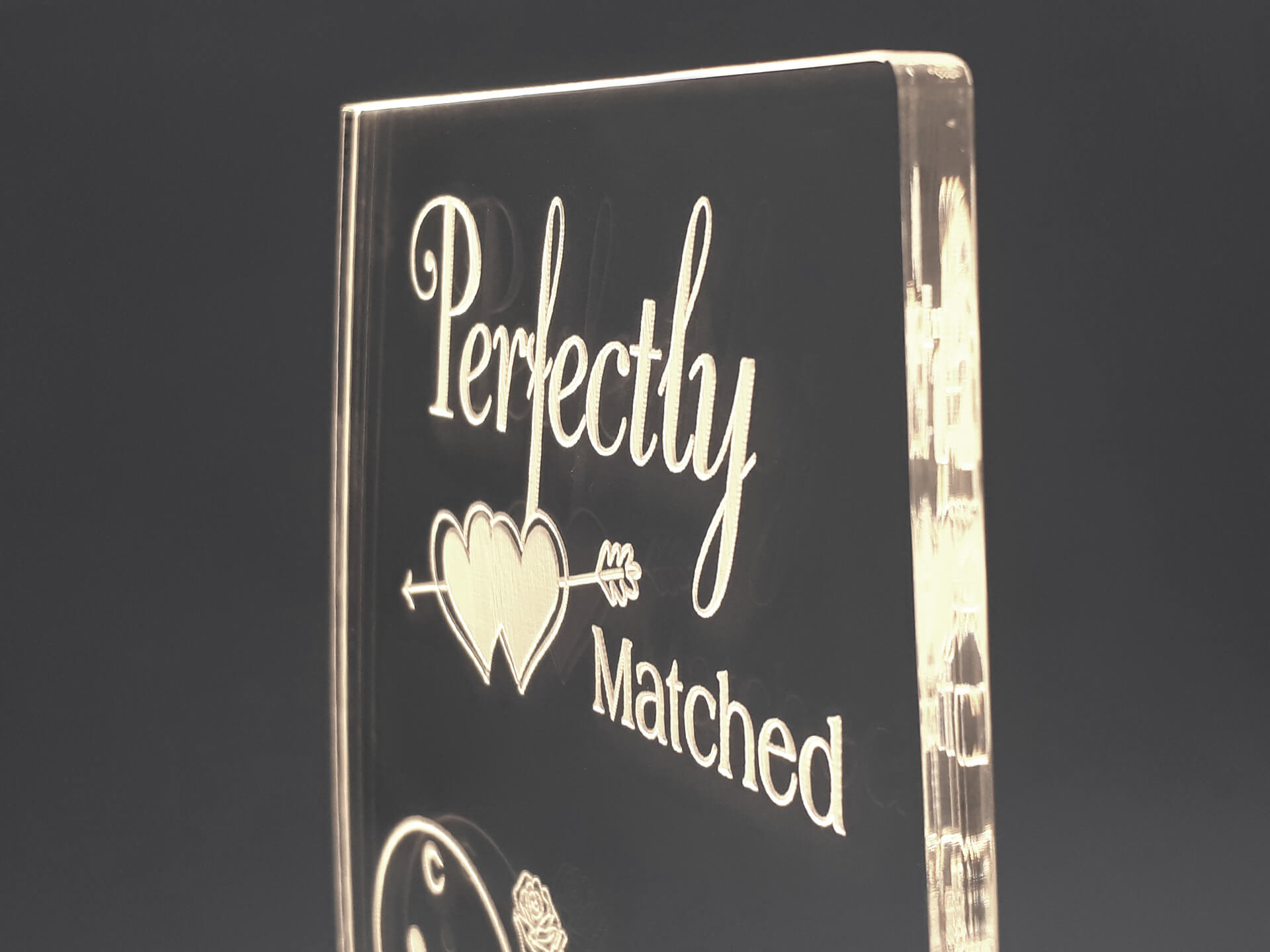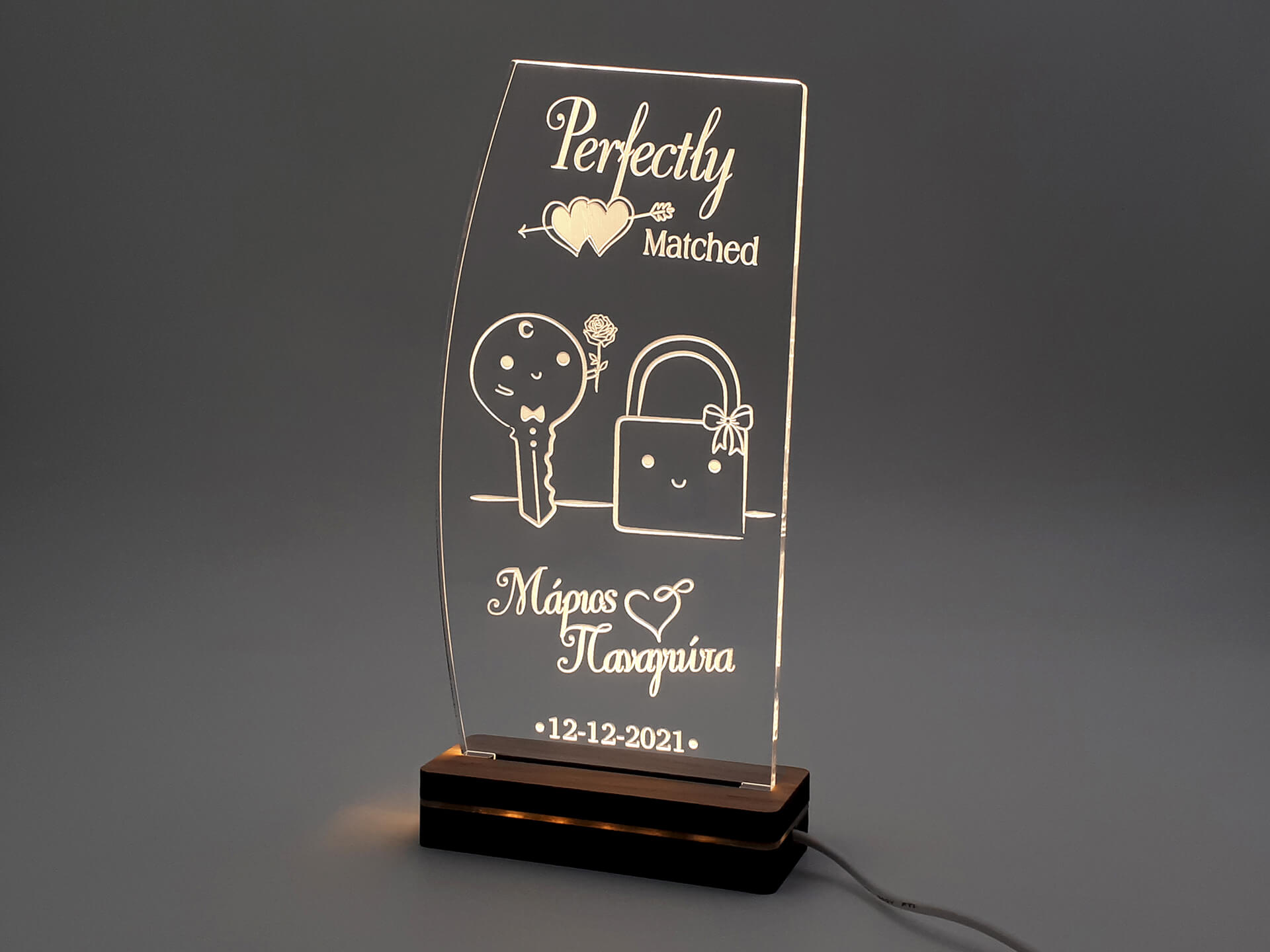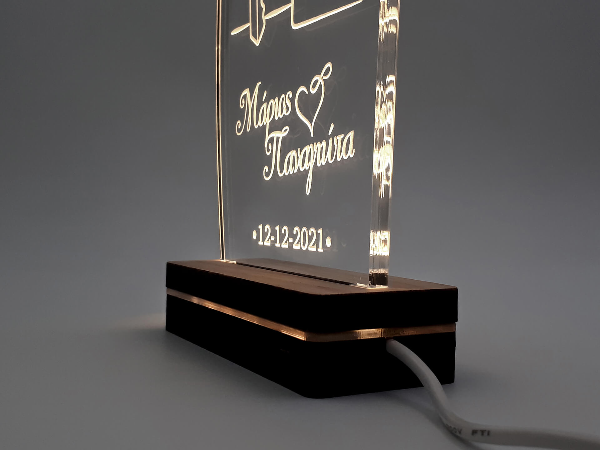 • Υλικά: Led λευκού χρώματος, Ακρυλικό διάφανο πάχους 6mm, Χειροποίητη βάση από ξύλο και ακρυλικό
