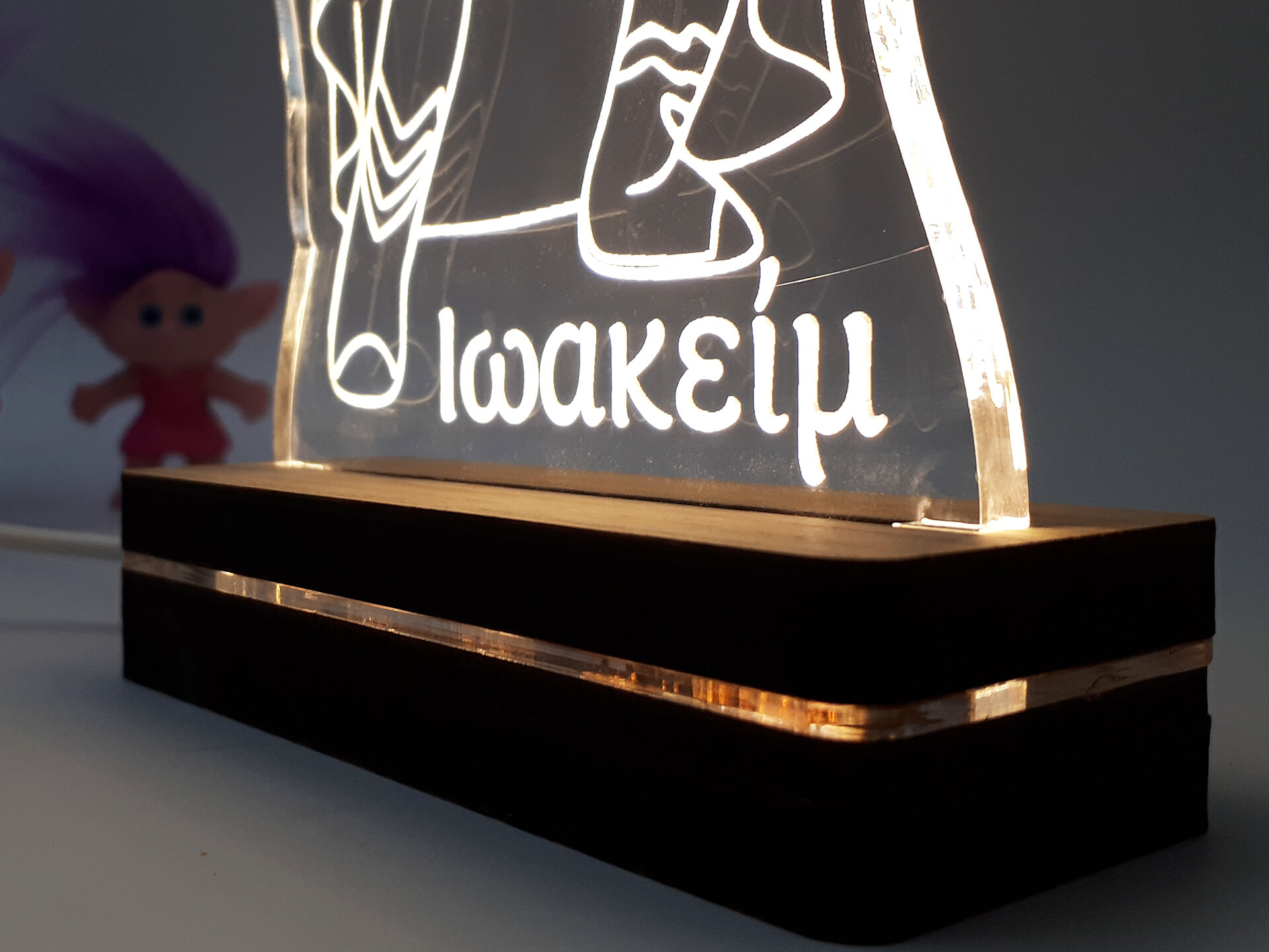 • Υλικά: Led λευκού χρώματος, Ακρυλικό διάφανο πάχους 6mm, Χειροποίητη βάση από ξύλο και ακρυλικό