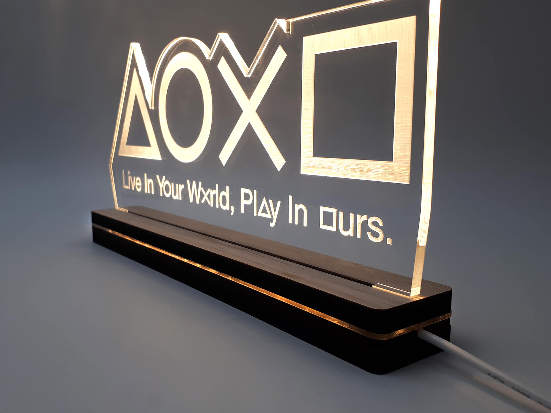 • Υλικά: Led λευκού χρώματος, Ακρυλικό διάφανο πάχους 6mm, Χειροποίητη βάση από ξύλο και ακρυλικό