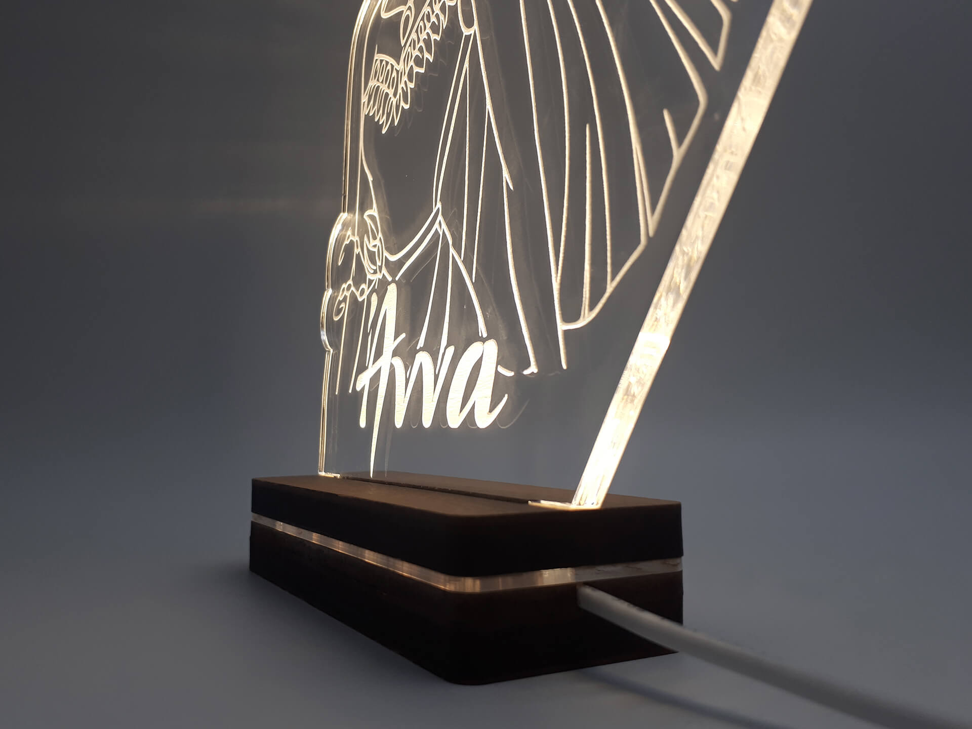 • Υλικά: Led λευκού χρώματος, Ακρυλικό διάφανο πάχους 6mm, Χειροποίητη βάση από ξύλο και ακρυλικό