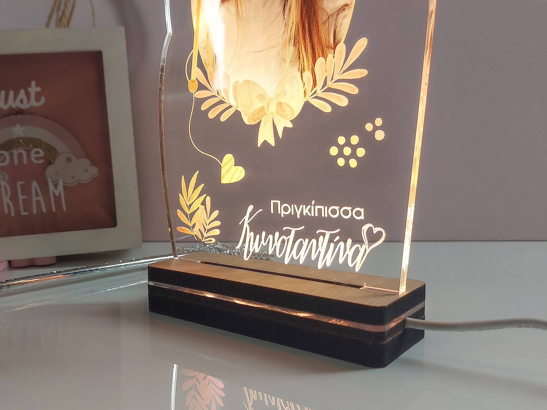• Υλικά: Led λευκού χρώματος, Ακρυλικό διάφανο πάχους 6mm, Χειροποίητη βάση από ξύλο και ακρυλικό