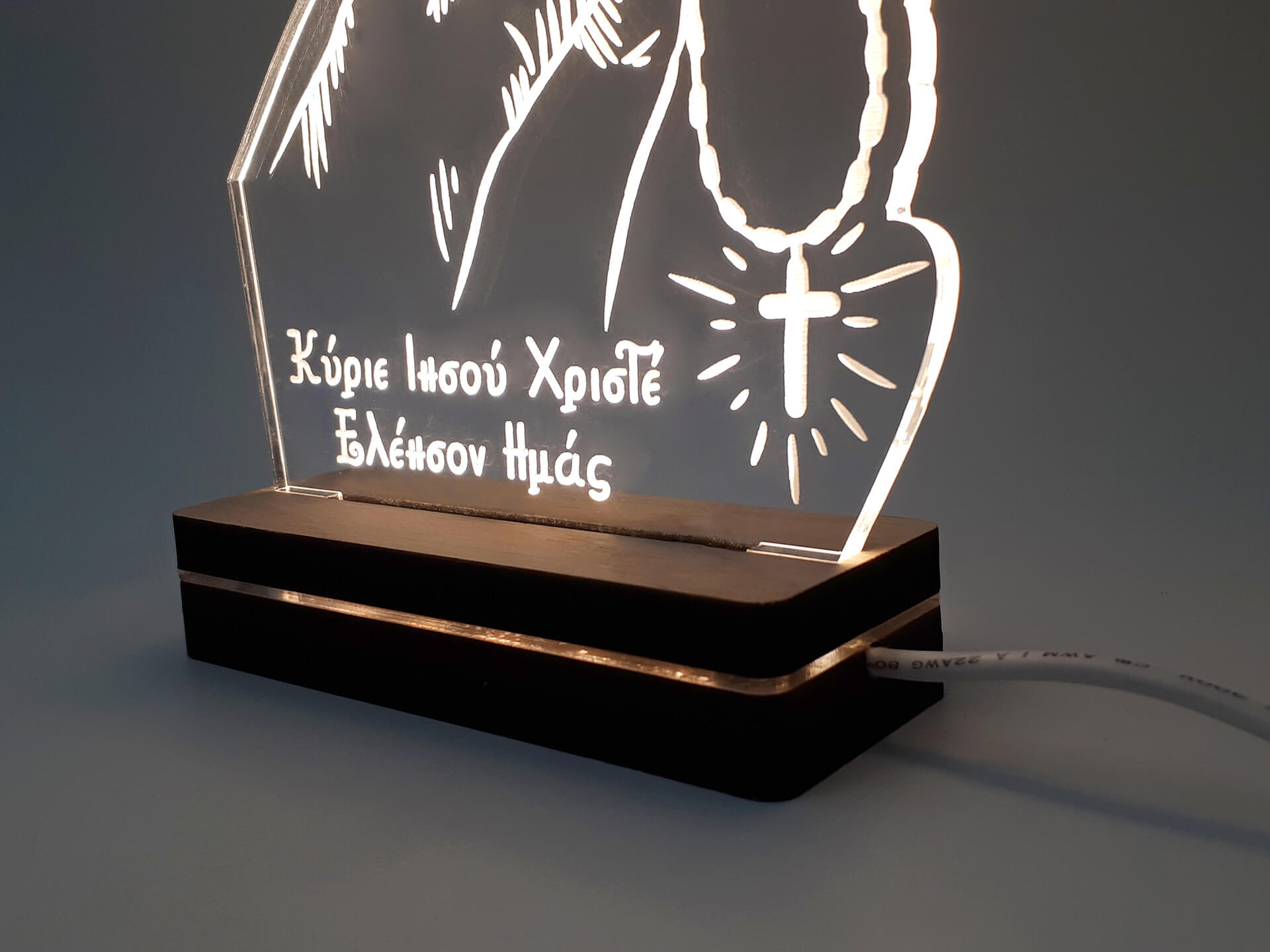 • Υλικά: Led λευκού χρώματος, Ακρυλικό διάφανο πάχους 6mm, Χειροποίητη βάση από ξύλο και ακρυλικό