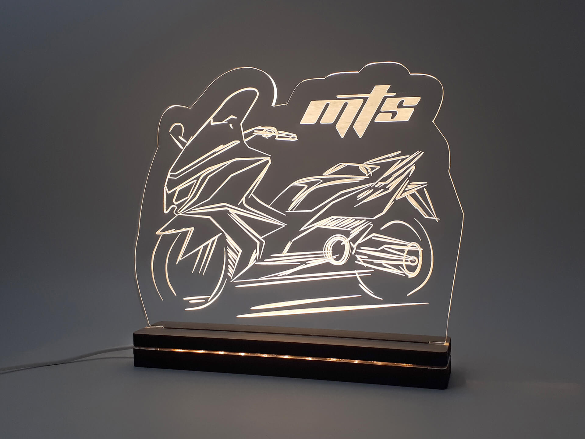 • Υλικά: Led λευκού χρώματος, Ακρυλικό διάφανο πάχους 6mm, Χειροποίητη βάση από ξύλο και ακρυλικό