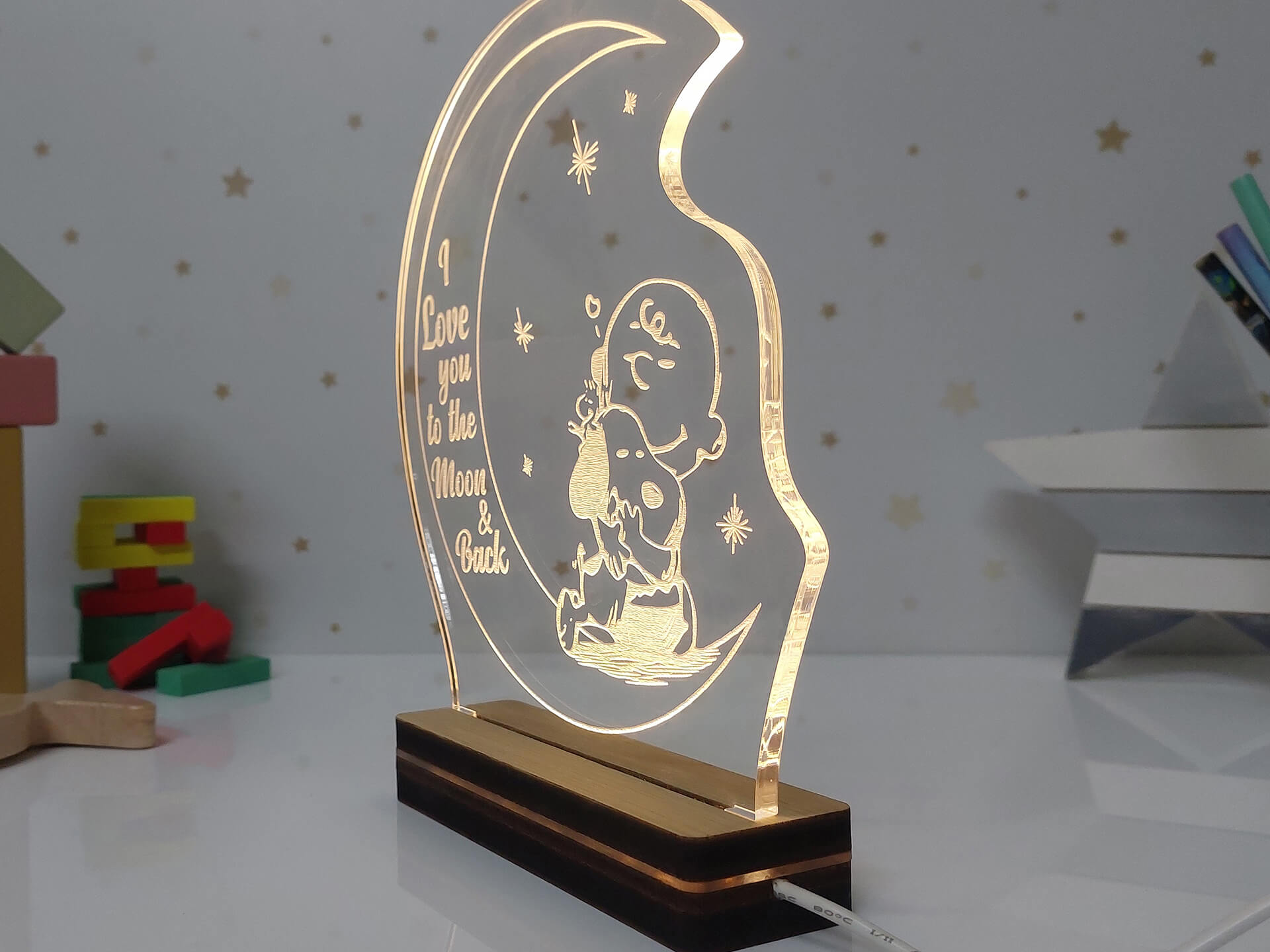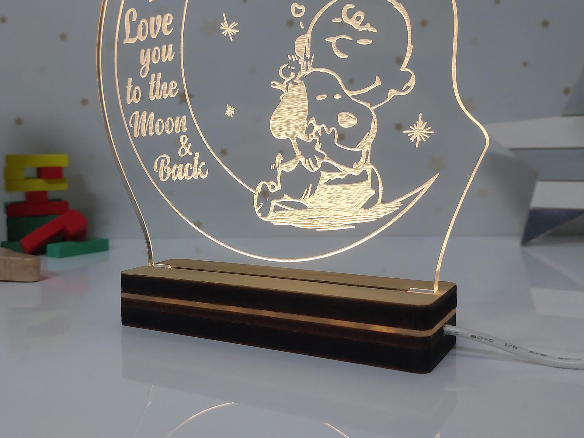 • Υλικά: Led λευκού χρώματος, Ακρυλικό διάφανο πάχους 6mm, Χειροποίητη βάση από ξύλο και ακρυλικό