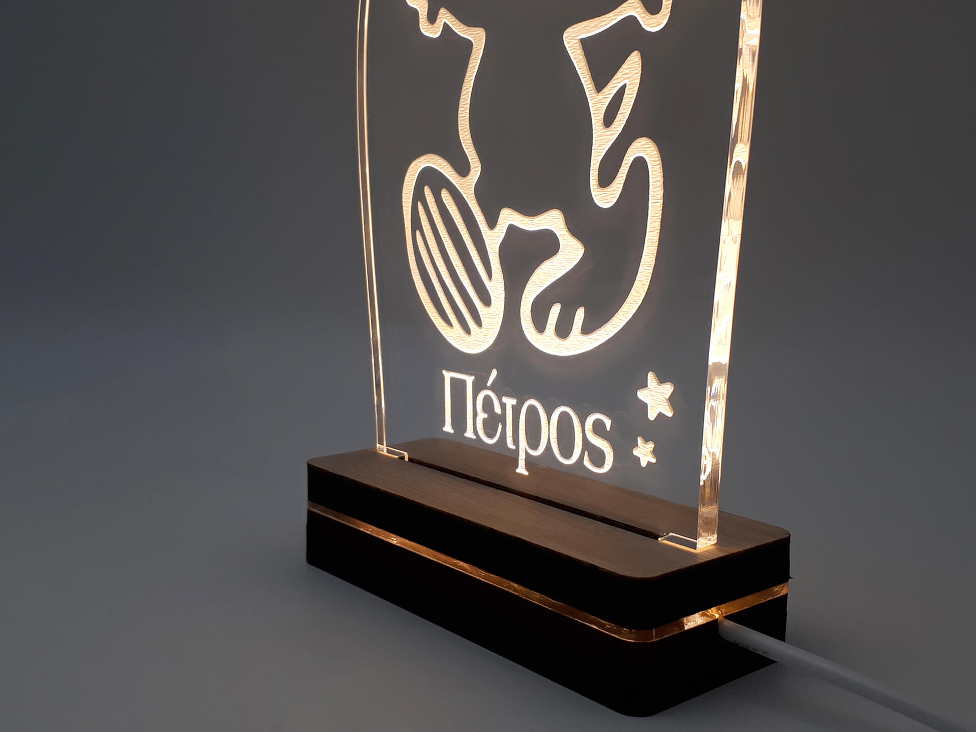 • Υλικά: Led λευκού χρώματος, Ακρυλικό διάφανο πάχους 6mm, Χειροποίητη βάση από ξύλο και ακρυλικό