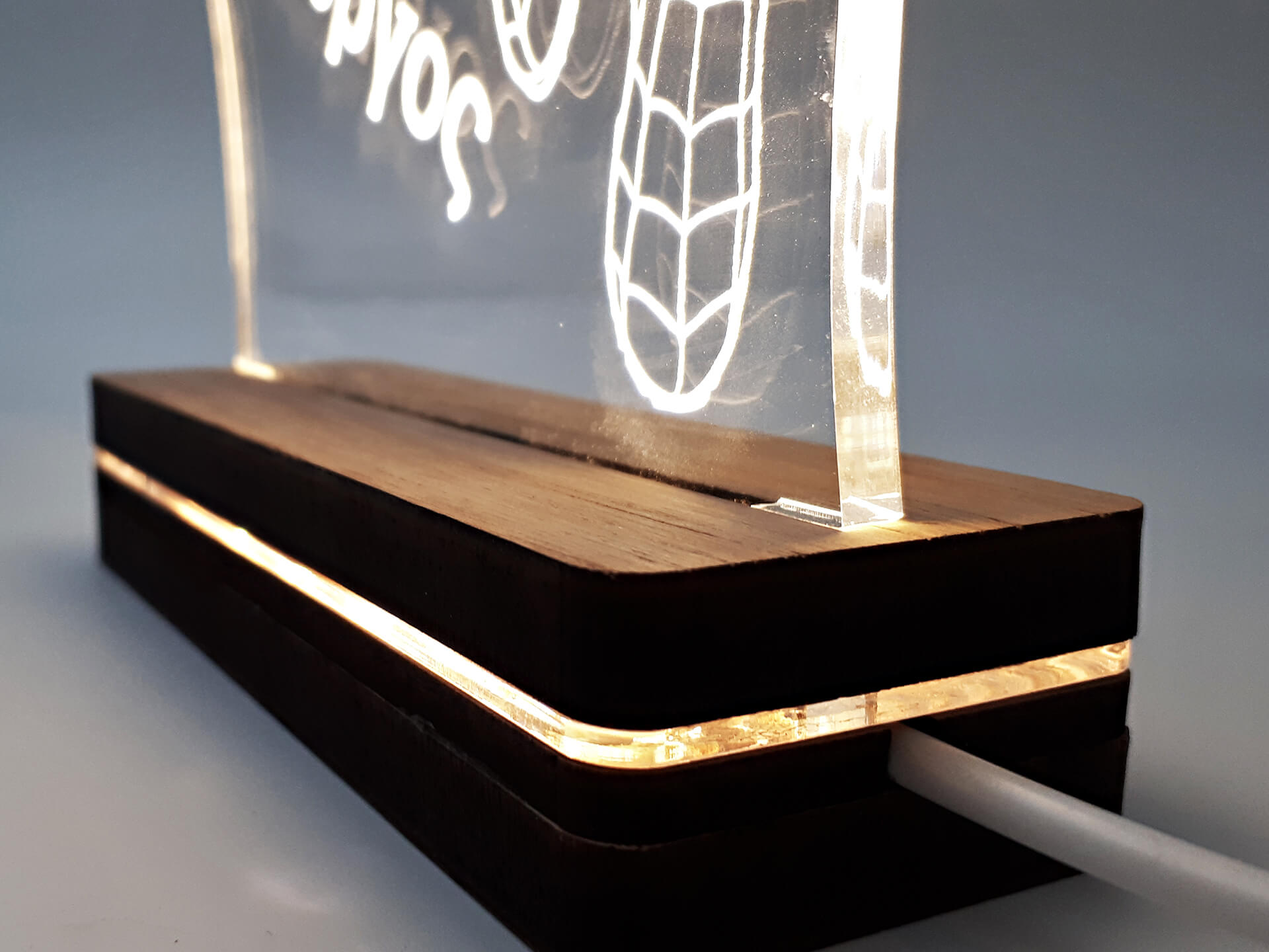 Φωτιστικό Led από ακρυλικό και ξύλινη χειροποίητη βάση δικής μας πρωτοποριακής σχεδίασης και κατασκευής.