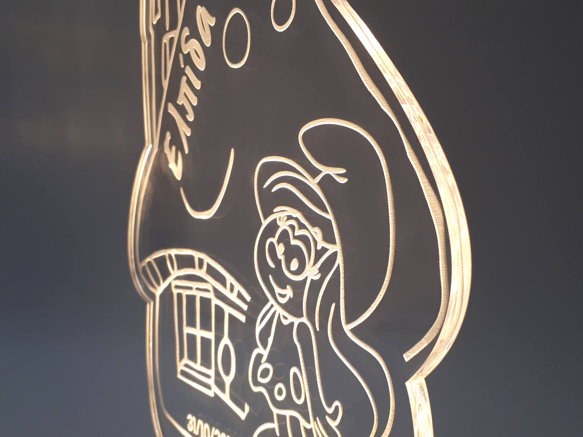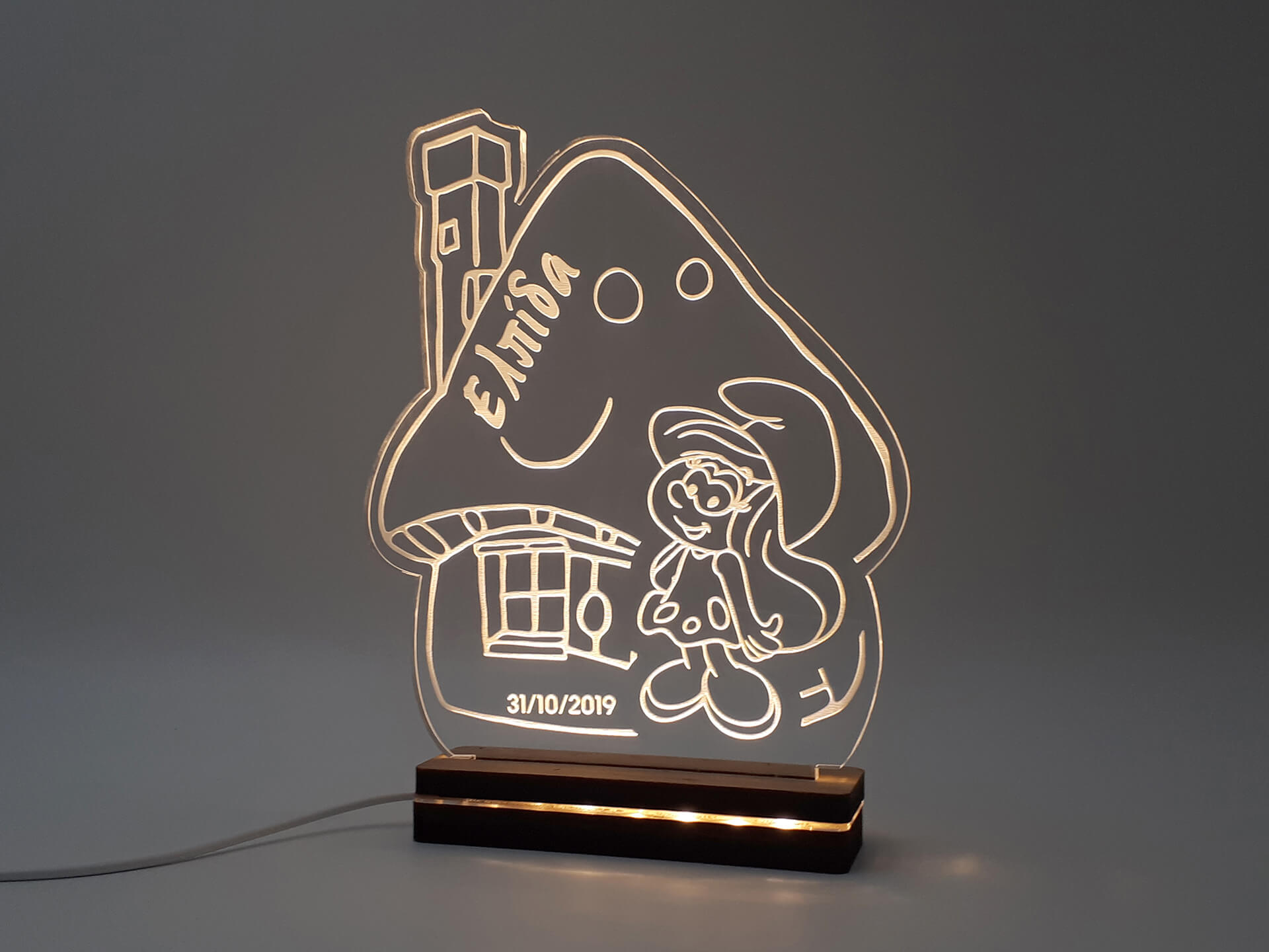 • Υλικά: Led λευκού χρώματος, Ακρυλικό διάφανο πάχους 6mm, Χειροποίητη βάση από ξύλο και ακρυλικό