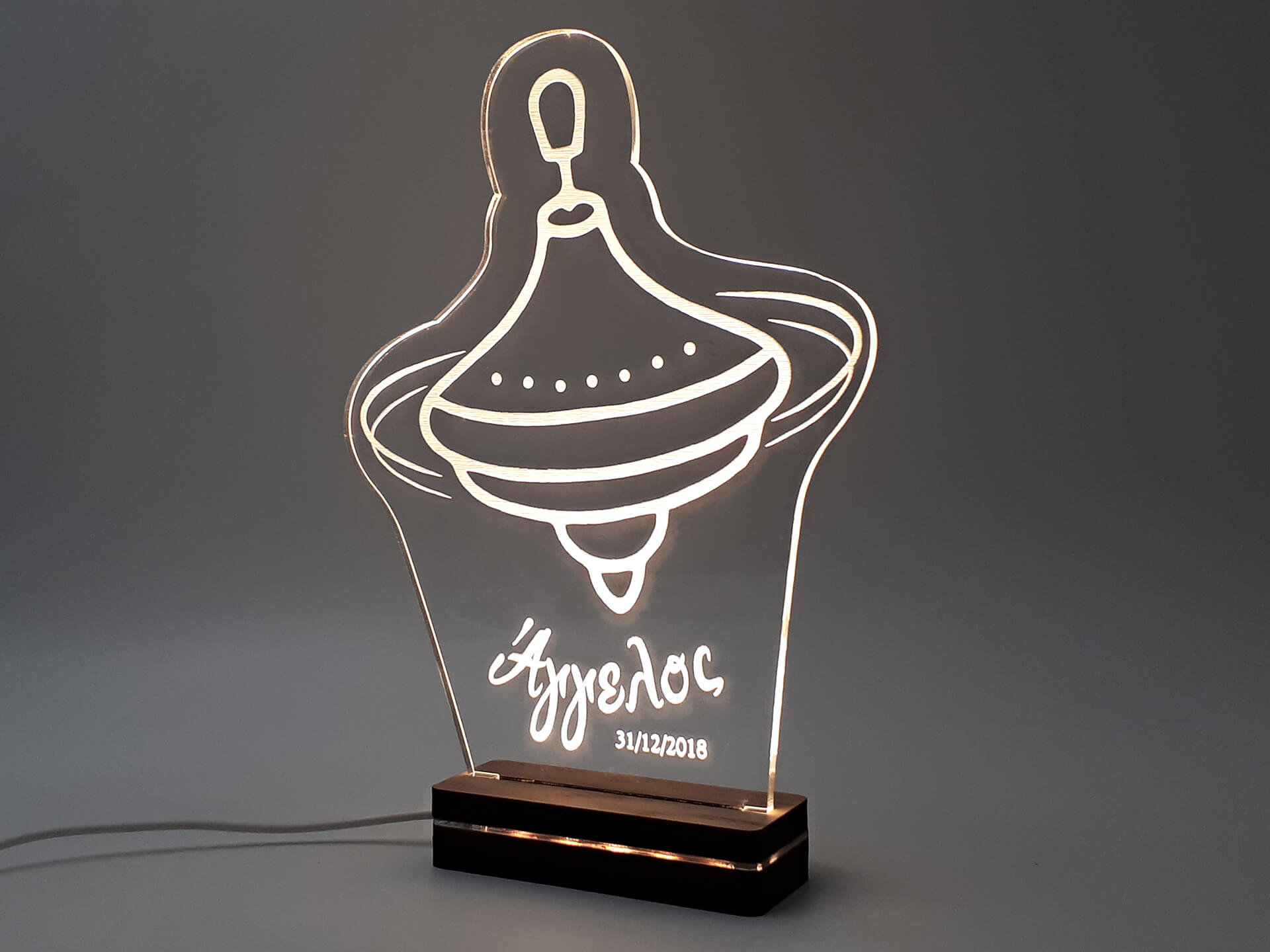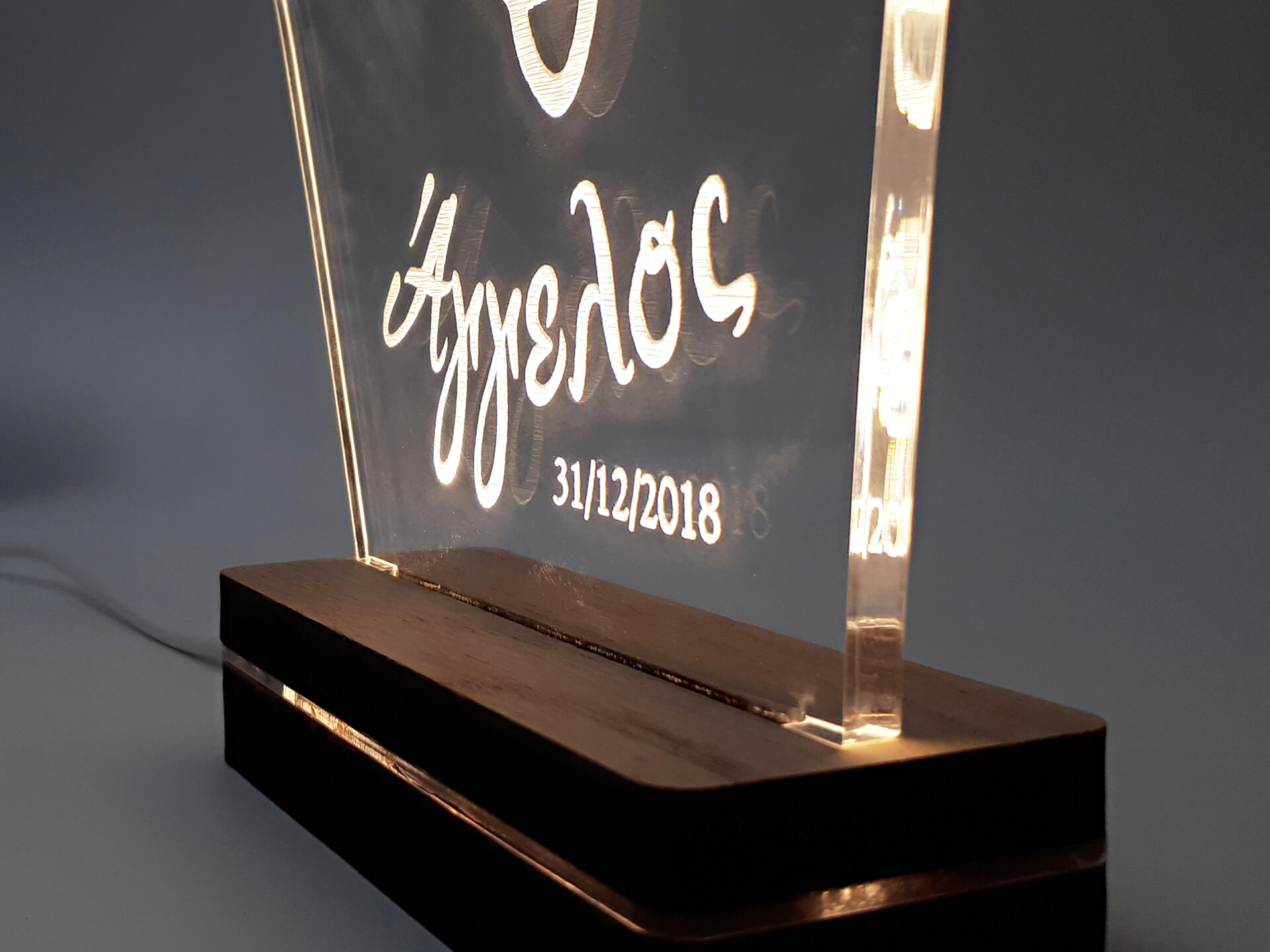 • Υλικά: Led λευκού χρώματος, Ακρυλικό διάφανο πάχους 6mm, Χειροποίητη βάση από ξύλο και ακρυλικό